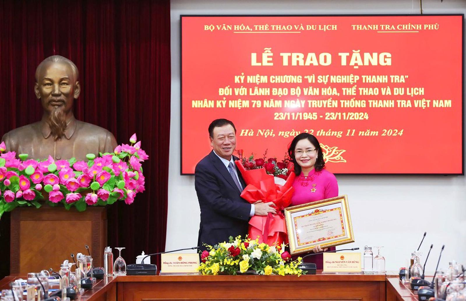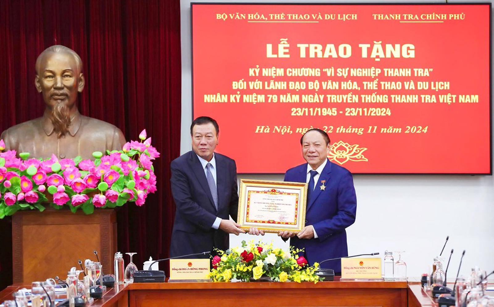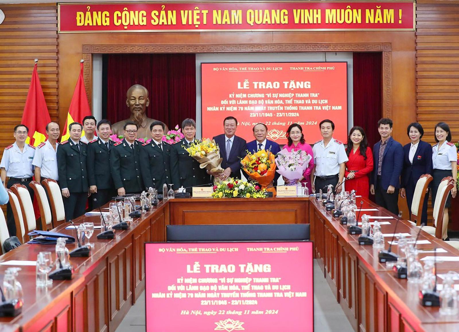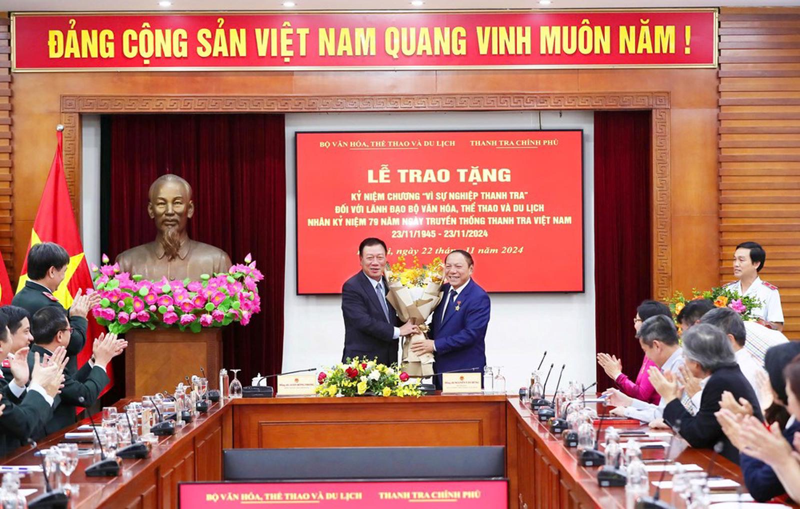 (Thanh tra) - Nhân kỷ niệm 79 năm Ngày Truyền thống Thanh tra Việt Nam (23/11/1945 - 23/11/2024), chiều 22/11, Bộ Văn hoá, Thể thao và Du lịch (VHTTDL) và Thanh tra Chính phủ đã trang trọng tổ chức Lễ trao tặng Kỷ niệm chương Vì sự nghiệp Thanh tra đối với lãnh đạo Bộ VHTTDL.