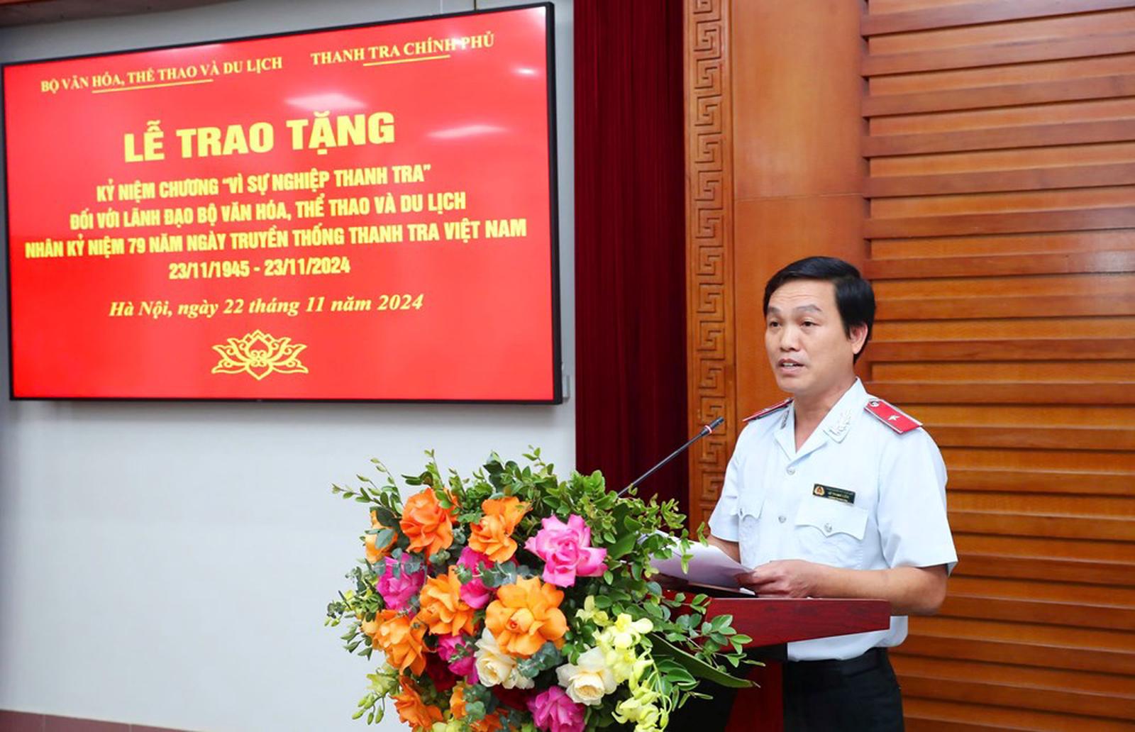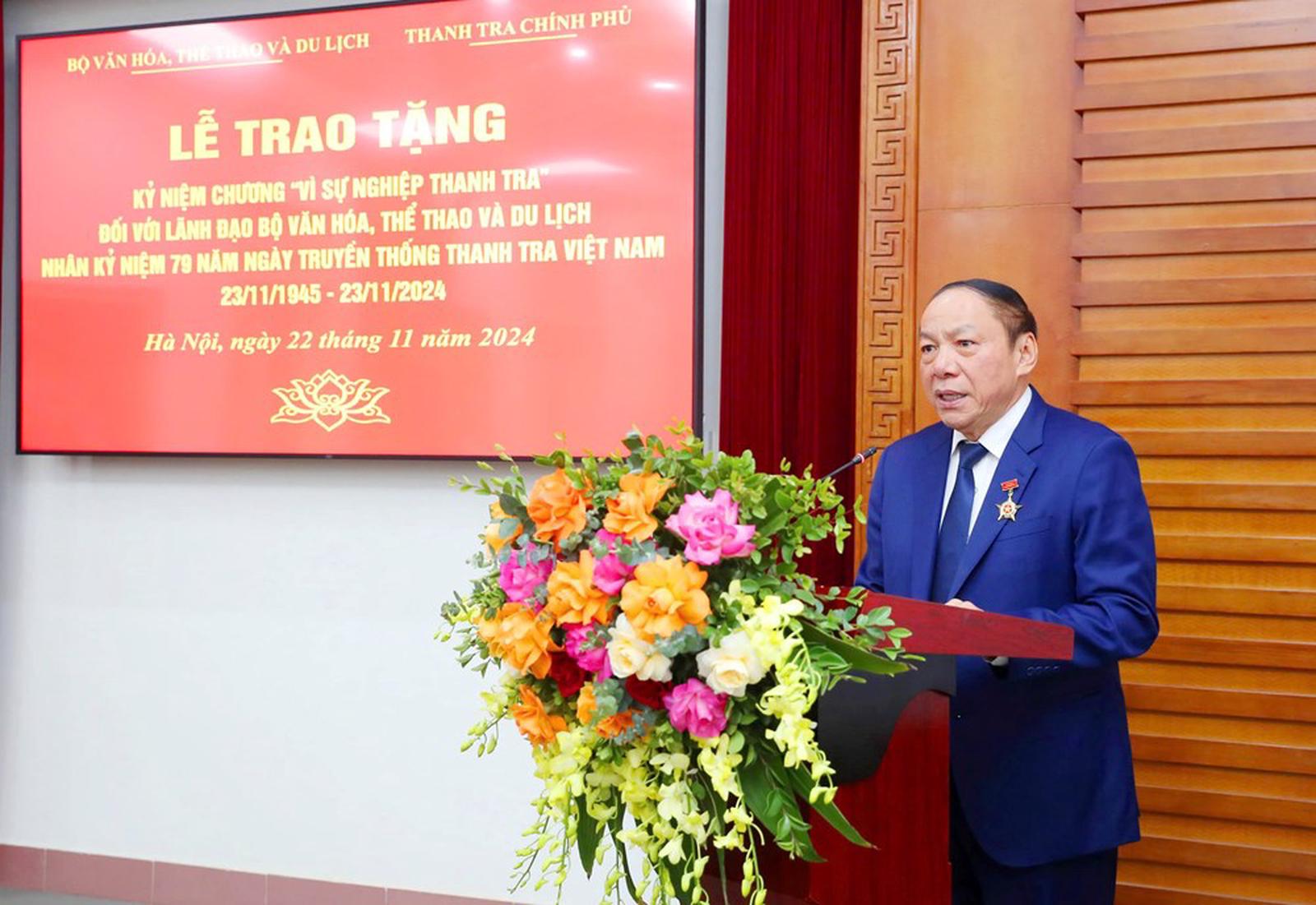 Tại buổi lễ, ông Nguyễn Hữu Hoà, Vụ trưởng Vụ Tổ chức cán bộ, Thanh tra Chính phủ đã công bố các quyết định tặng Kỷ niệm chương Vì sự nghiệp Thanh tra đối với Bộ trưởng Bộ VHTTDL Nguyễn Văn Hùng và Thứ trưởng Bộ VHTTDL Trịnh Thị Thủy.