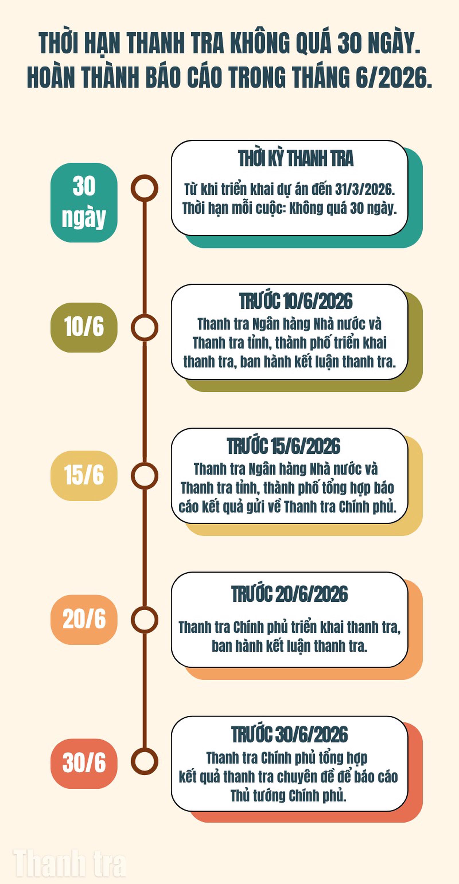 Về tiến độ thực hiện, Thanh tra Ngân hàng Nhà nước và thanh tra các địa phương phải triển khai thanh tra, ban hành kết luận thanh tra trước ngày 10/6/2026, sau đó tổng hợp báo cáo kết quả gửi về Thanh tra Chính phủ trước ngày 15/6/2026.