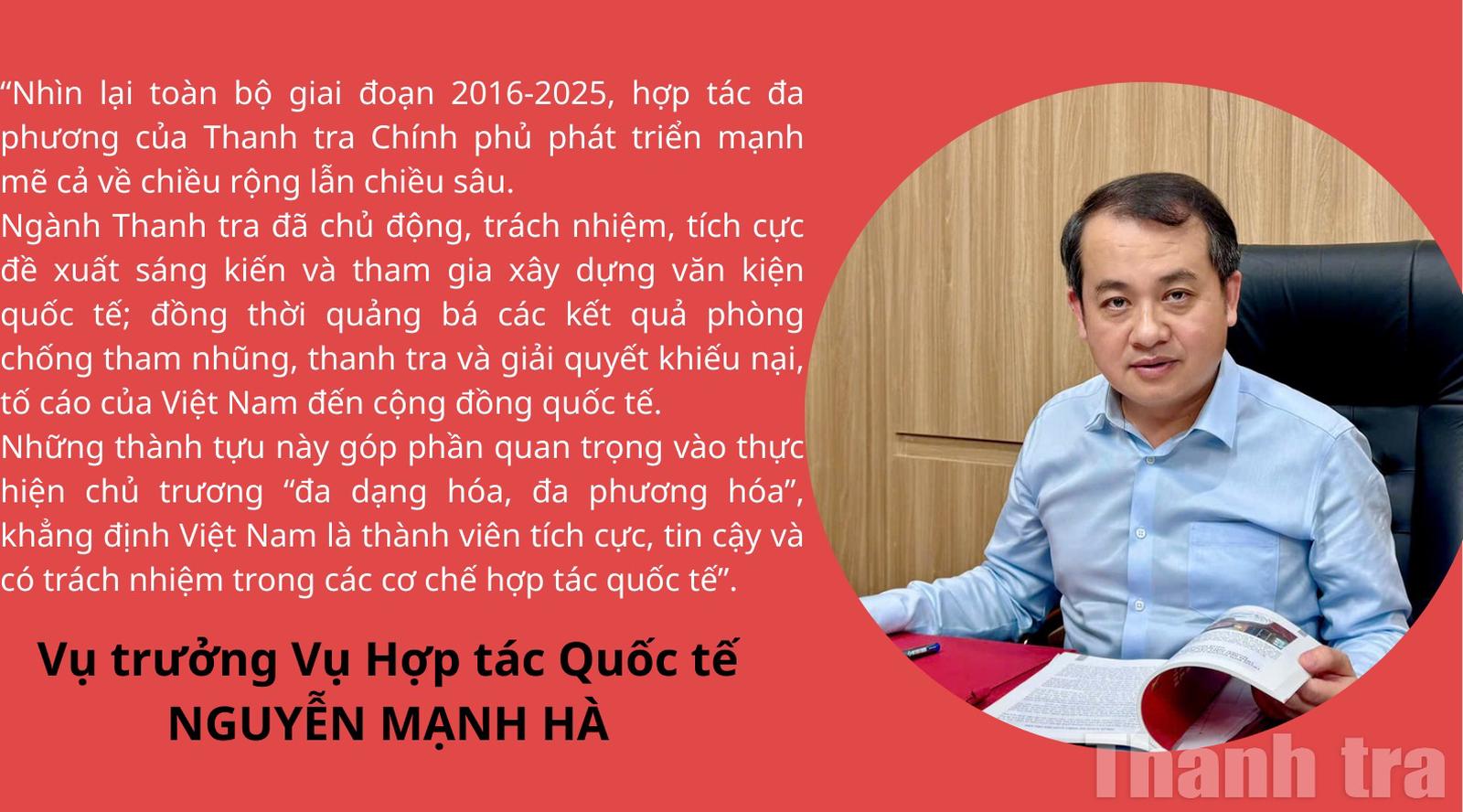 Theo ông Nguyễn Mạnh Hà, Vụ trưởng Vụ Hợp tác Quốc tế, Thanh tra Chính phủ, trong giai đoạn 2016-2025, Thanh tra Chính phủ triển khai hợp tác đa phương trên cơ sở bám sát đường lối, nghị quyết của Đảng về nâng tầm đối ngoại đa phương và chủ động hội nhập quốc tế.
