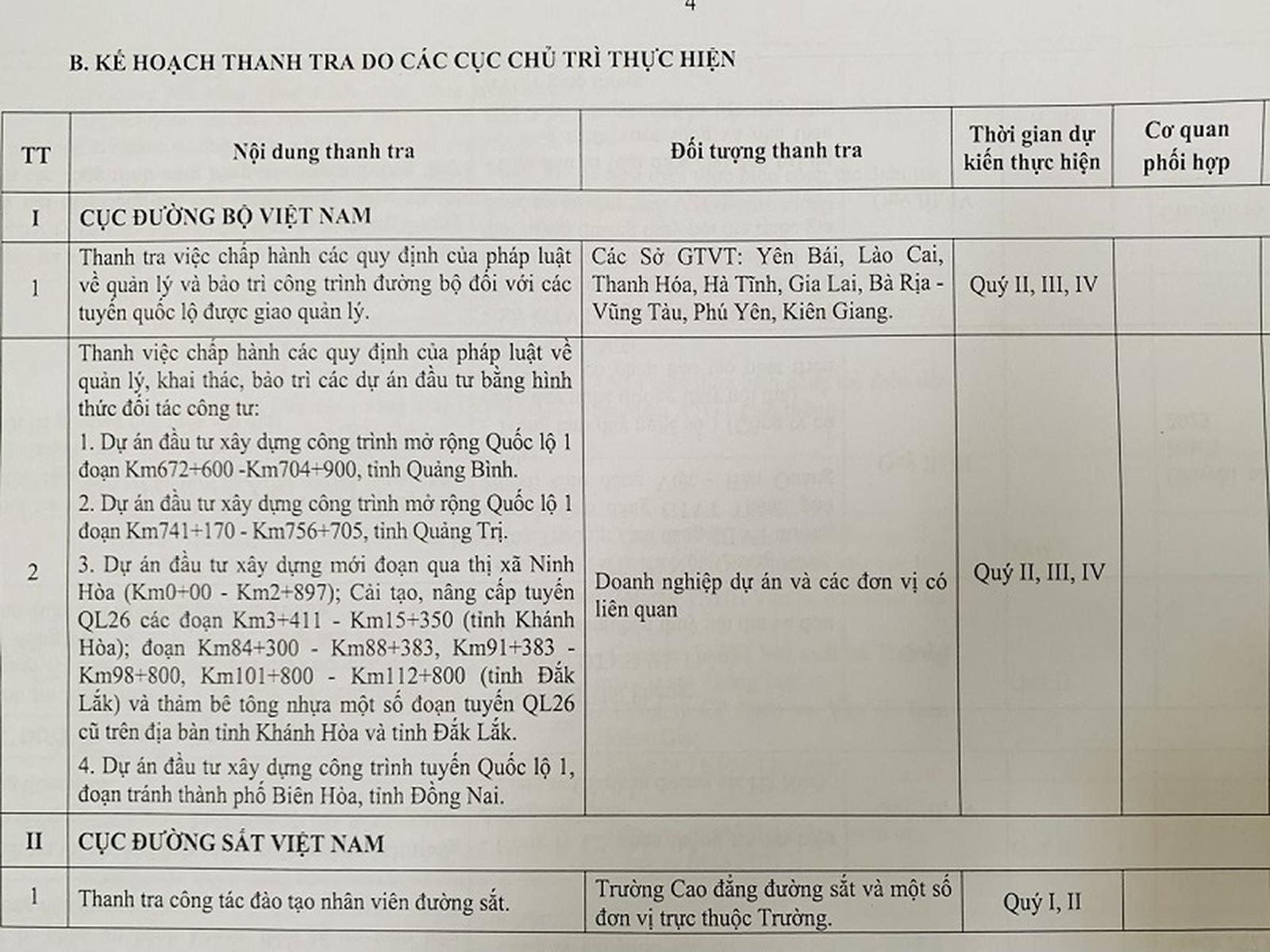 Thanh tra việc chấp hành quy định pháp luật về quản lý, khai thác, bảo trì các dự án đầu tư bằng hình thức đối tác công tư: Dự án đầu tư xây dựng công trình mở rộng Quốc lộ 1 đoạn Km672+600-Km704+900, tỉnh Quảng Bình; dự án đầu tư xây dựng công trình mở rộng Quốc lộ 1 đoạn Km741+170 - Km756+705, tỉnh Quảng Trị; dự án đầu tư xây dựng mới đoạn qua thị xã Ninh Hòa (Km0+00 - Km2+897); cải tạo, nâng cấp tuyến Quốc lộ 26 các đoạn Km3+411 - Km15+350 (tỉnh Khánh Hòa); đoạn Km84+300 - Km88+383, Km91+383 Km98+800, Km101+800 - Km112+800 (tỉnh Đắk Lắk) và thảm bê tông nhựa một số đoạn tuyến Quốc lộ 26 cũ trên địa bàn tỉnh Khánh Hòa và tỉnh Đắk Lắk; dự án đầu tư xây dựng công trình tuyến Quốc lộ 1, đoạn tránh thành phố Biên Hòa, tỉnh Đồng Nai.