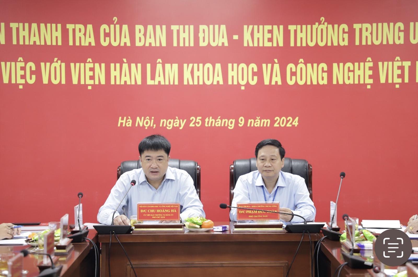 Phó Trưởng Ban Thi đua - Khen thưởng Trung ương Phạm Đức Toàn và Phó Chủ tịch Viện Hàn lâm Khoa học và Công nghệ Việt Nam Chu Hoàng Hà chủ trì buổi công bố quyết định thanh tra. Ảnh: Viện Hàn lâm KH&CN Việt Nam