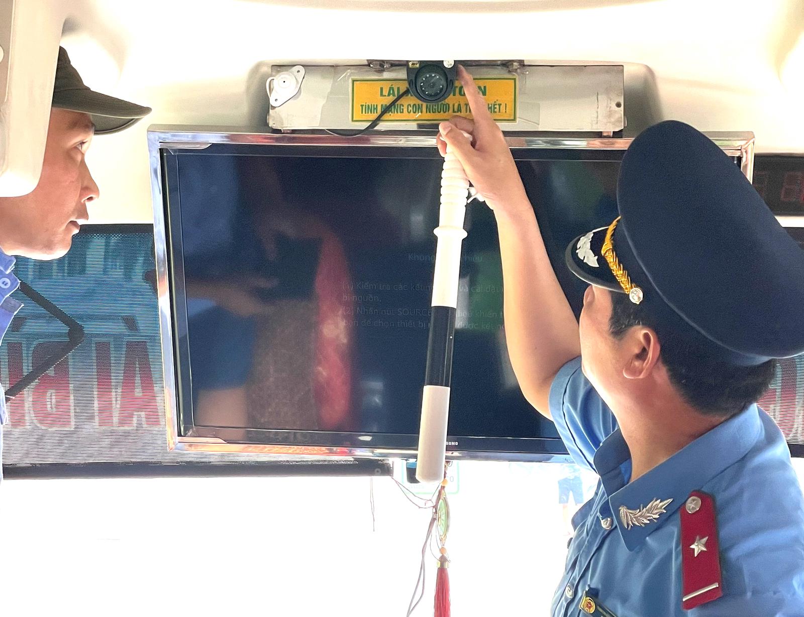 Lực lượng Thanh tra Sở GTVT Thái Bình kiểm tra thiết bị kết nối, giám sát của xe vận tải hành khách. Ảnh: Trọng Tài