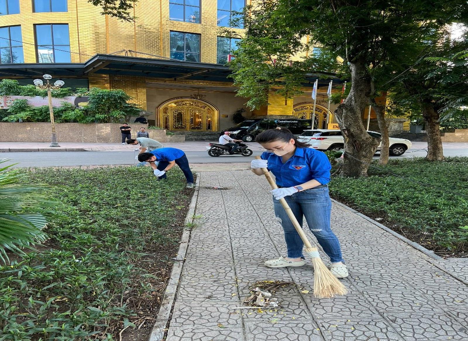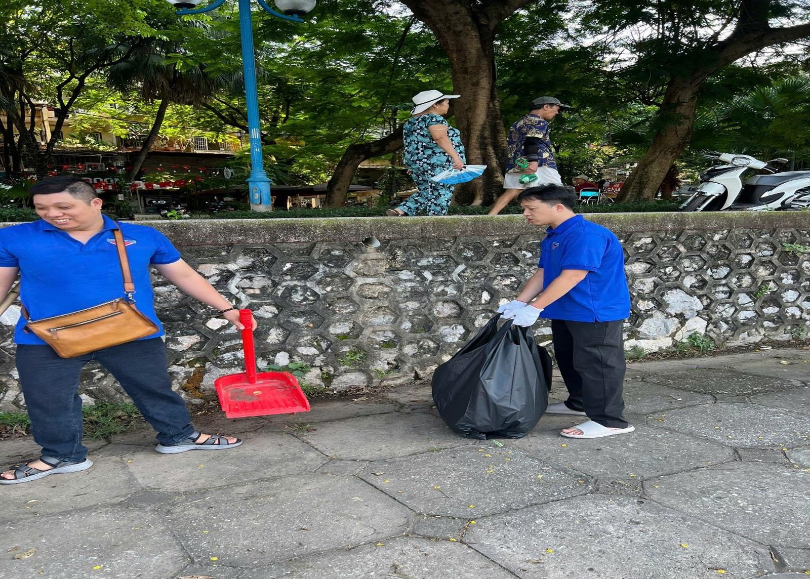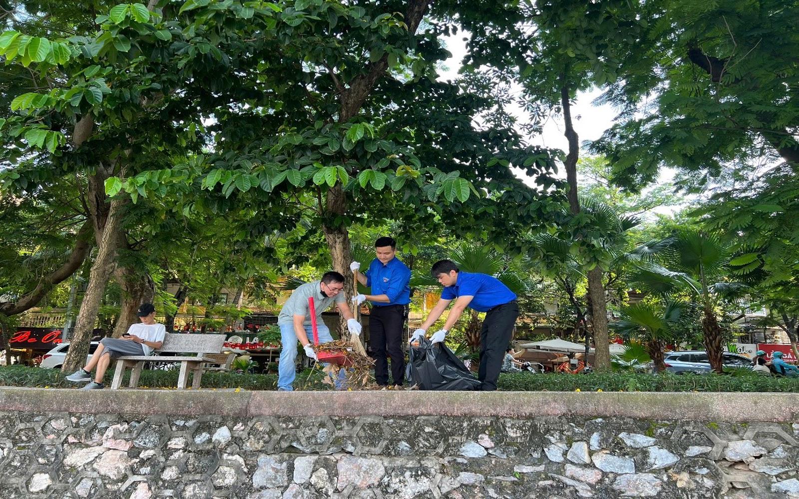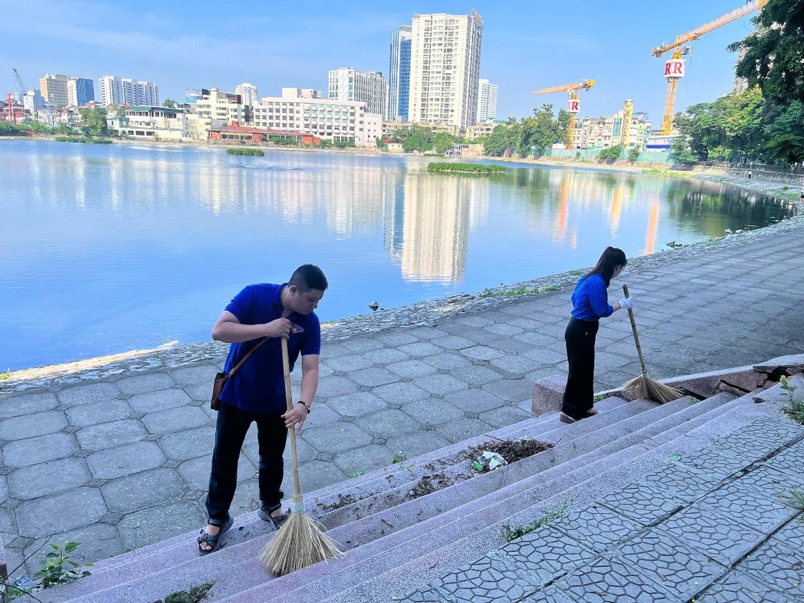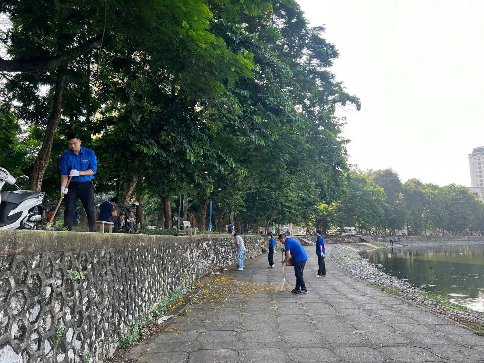Đoàn viên Thanh niên Thanh tra thành phố dọn dẹp vệ sinh môi trường quanh hồ Giảng Võ. Ảnh: Mai Lâm