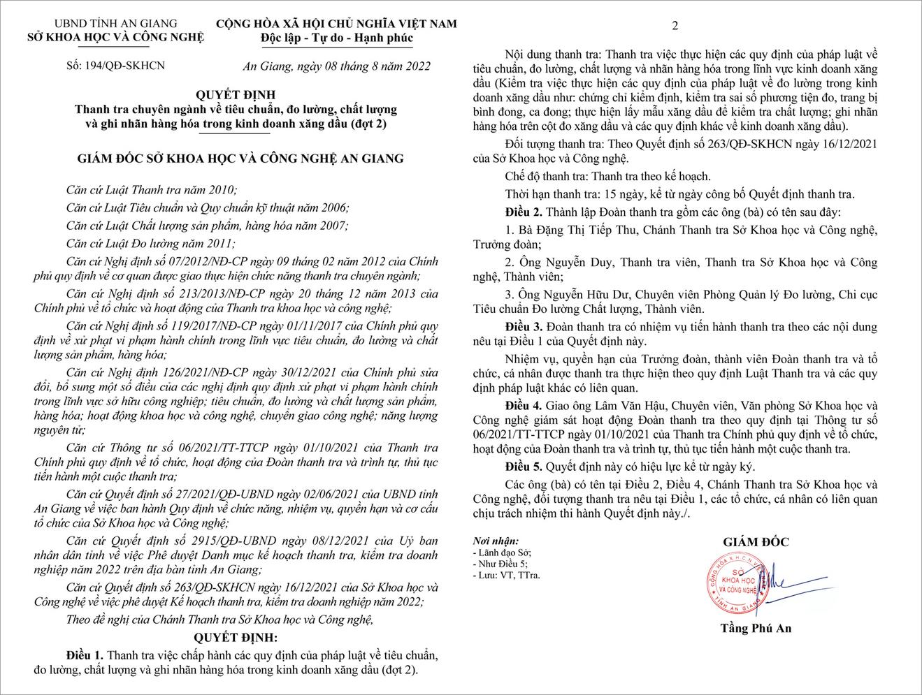 Quyết định thanh tra của Sở Khoa học và Công nghệ An Giang. Ảnh: NM