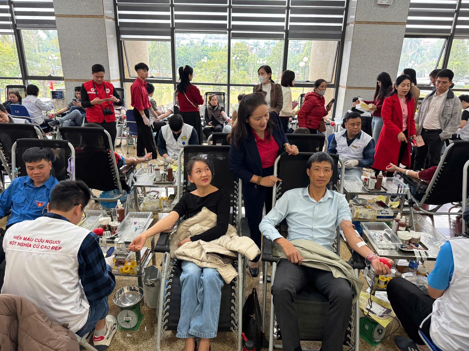 Không khí vui tươi và sôi nổi trong buổi hiến máu tình nguyện. Ảnh: Thanh tra tỉnh