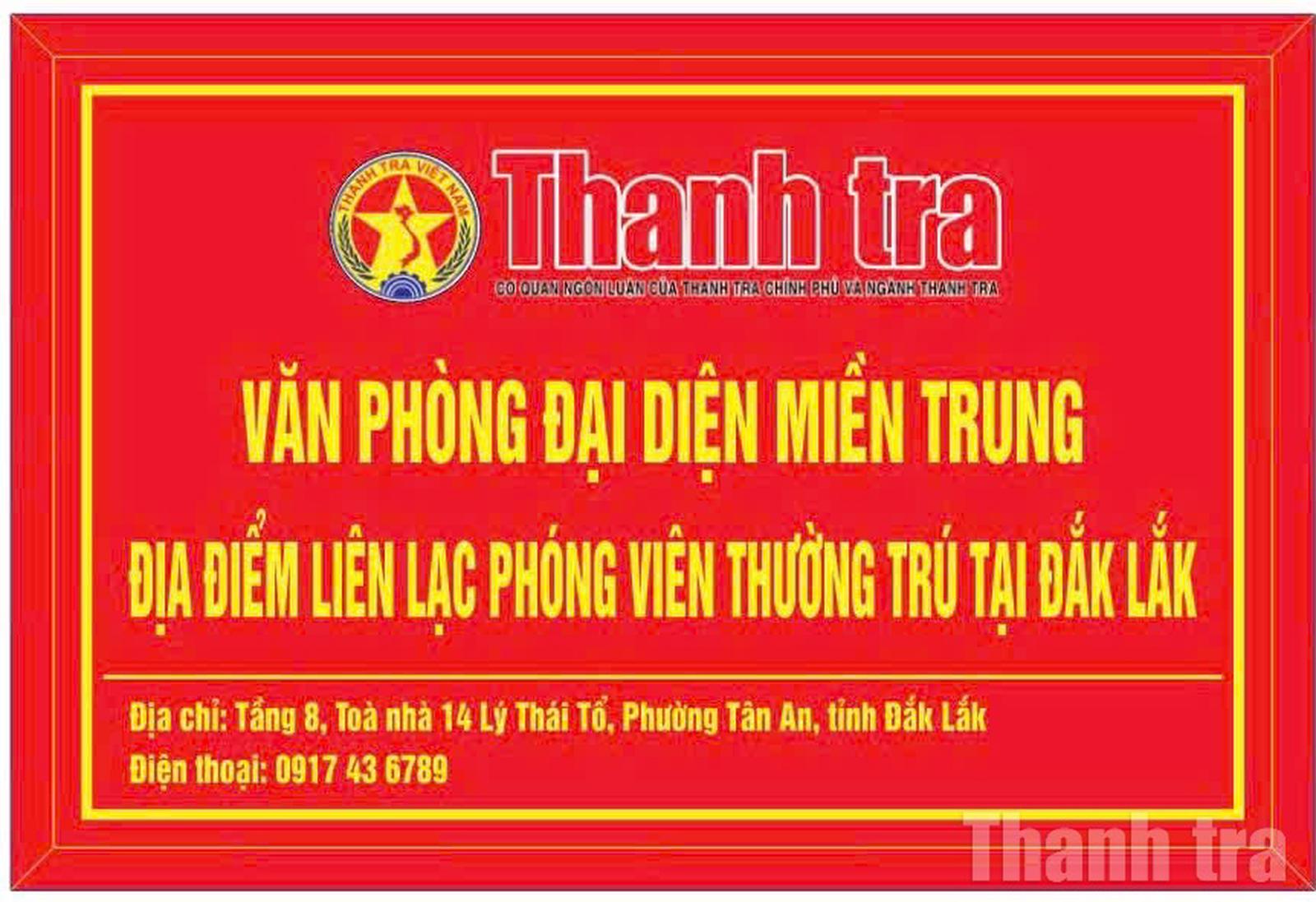 Hiện nay, Văn phòng đại diện Báo Thanh tra khu vực miền Trung cũng bố trí địa điểm liên lạc của phóng viên thường trú tỉnh Đắk Lắk tại tầng 8, Tòa nhà làm việc Thanh tra tỉnh số 14 đường Lý Thái Tổ, phường Tân An, tỉnh Đắk Lắk, số điện thoại 0917.43.6789.