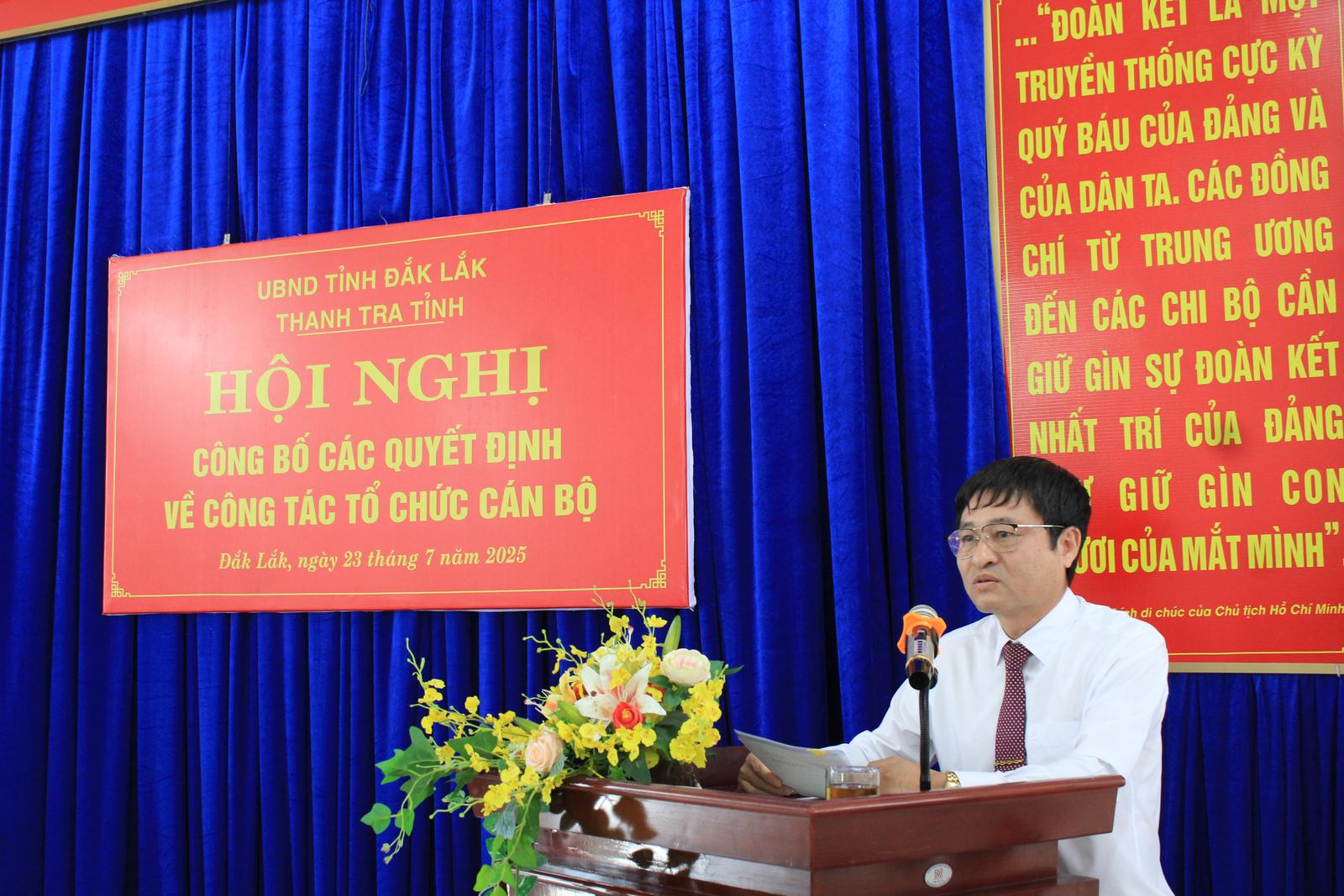 Ngày 23/7, Thanh tra tỉnh Đắk Lắk tổ chức Hội nghị công bố các quyết định về công tác tổ chức và cán bộ tại Cơ sở 2, đặt tại địa bàn phía Đông của tỉnh Đắk Lắk.