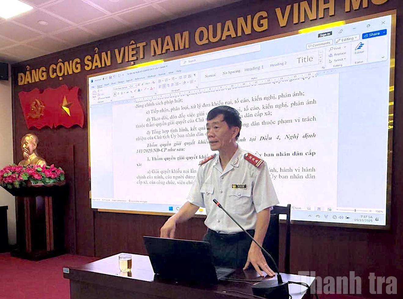 Phó Chánh Thanh tra tỉnh Điện Biên Trần Văn Chiến truyền đạt các nội dung quan trọng về công tác tiếp công dân, xử lý đơn thư và giải quyết khiếu nại, tố cáo cho cán bộ cấp xã và các ngành sau khi thực hiện mô hình chính quyền địa phương 2 cấp. Ảnh: PV