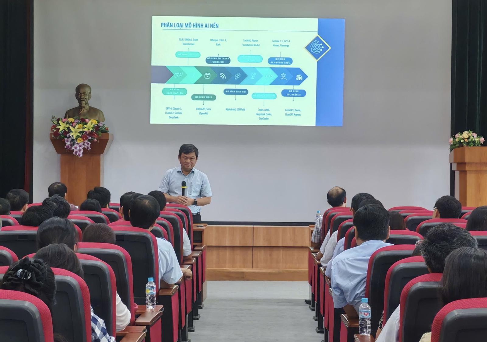 Báo cáo viên Trần Kim Kha chia sẻ nhiều kinh nghiệm thực tiễn và cập nhật xu thế ứng dụng AI trong quản lý Nhà nước. Ảnh: TTTGL