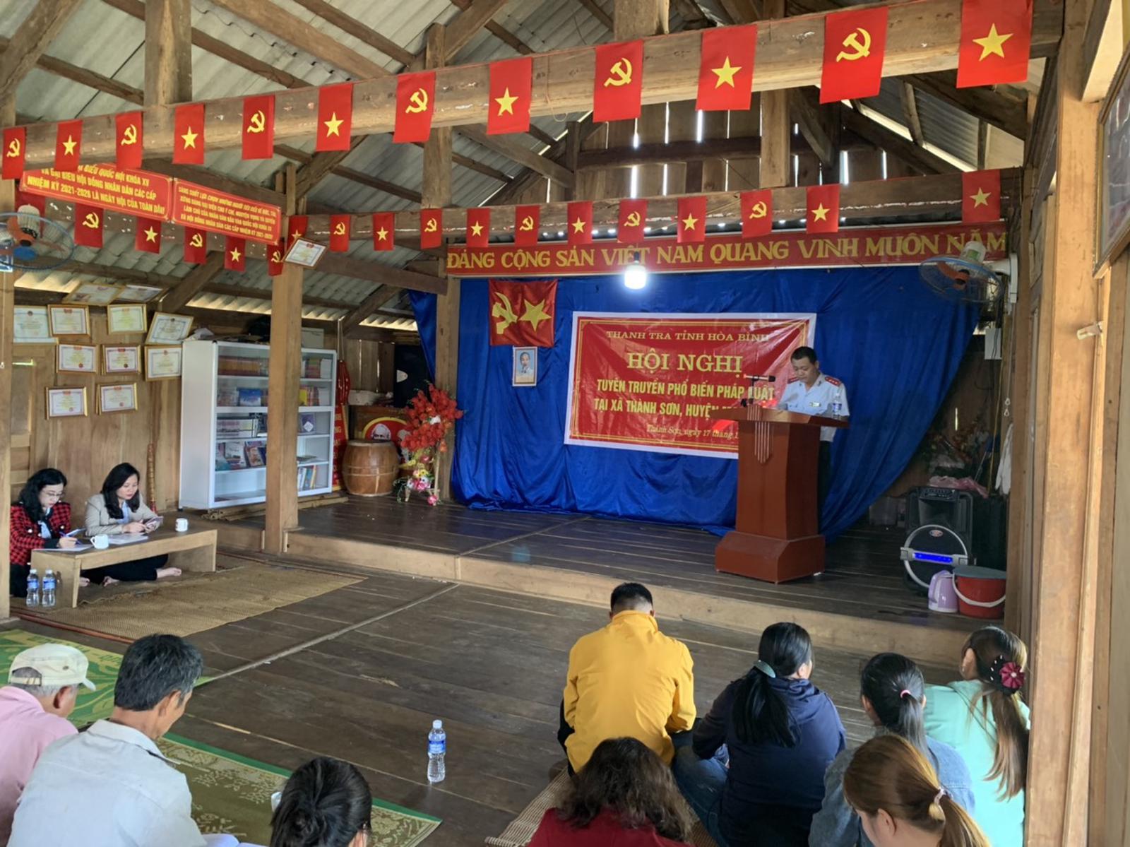 Ông Lê Huy Hoàng, Phó Chánh Thanh tra tỉnh Hoà Bình tuyên truyền pháp luật cho Nhân dân xóm Nà Phặt, xã Thành Sơn, huyện Mai Châu. Ảnh: Mạnh Hùng