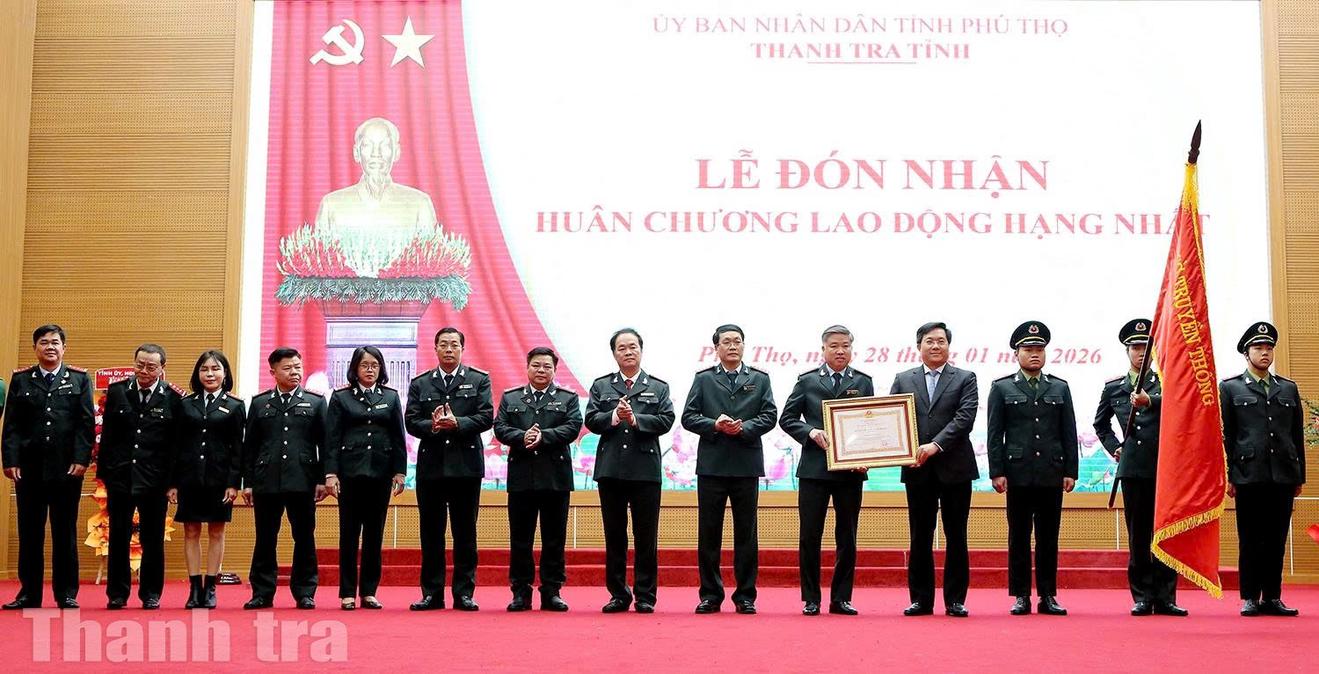 Thanh tra tỉnh Phú Thọ đón nhận Huân chương Lao động hạng Nhất tại hội nghị triển khai nhiệm vụ năm 2026. Ảnh: TK