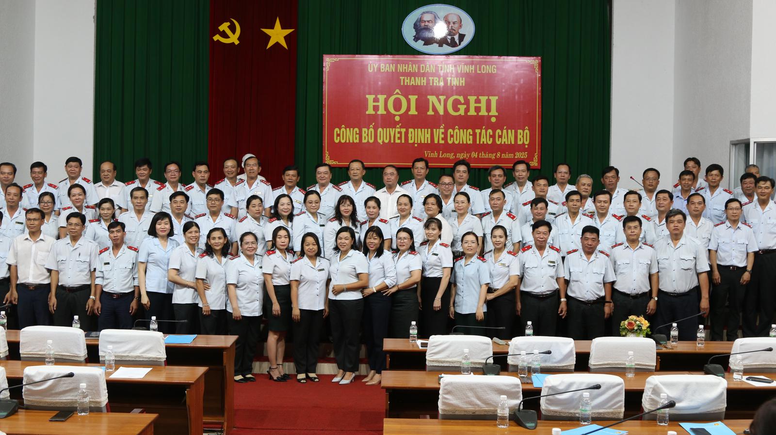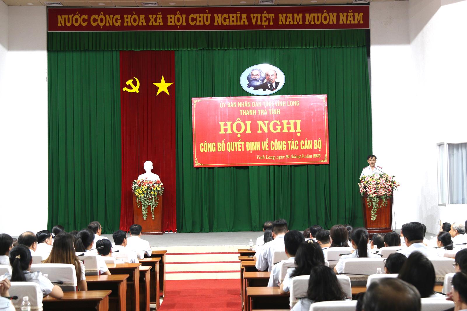 (Thanh tra) - Ngày 4/8/2025, Thanh tra tỉnh Vĩnh Long đã tổ chức Hội nghị công bố quyết định tiếp nhận và bổ nhiệm công chức đối với các phòng trực thuộc Thanh tra tỉnh. Sự kiện này đánh dấu bước ngoặt quan trọng trong công tác tổ chức cán bộ, nhằm kiện toàn bộ máy lãnh đạo, nâng cao hiệu quả hoạt động thanh tra, góp phần đáp ứng yêu cầu nhiệm vụ trong tình hình mới.