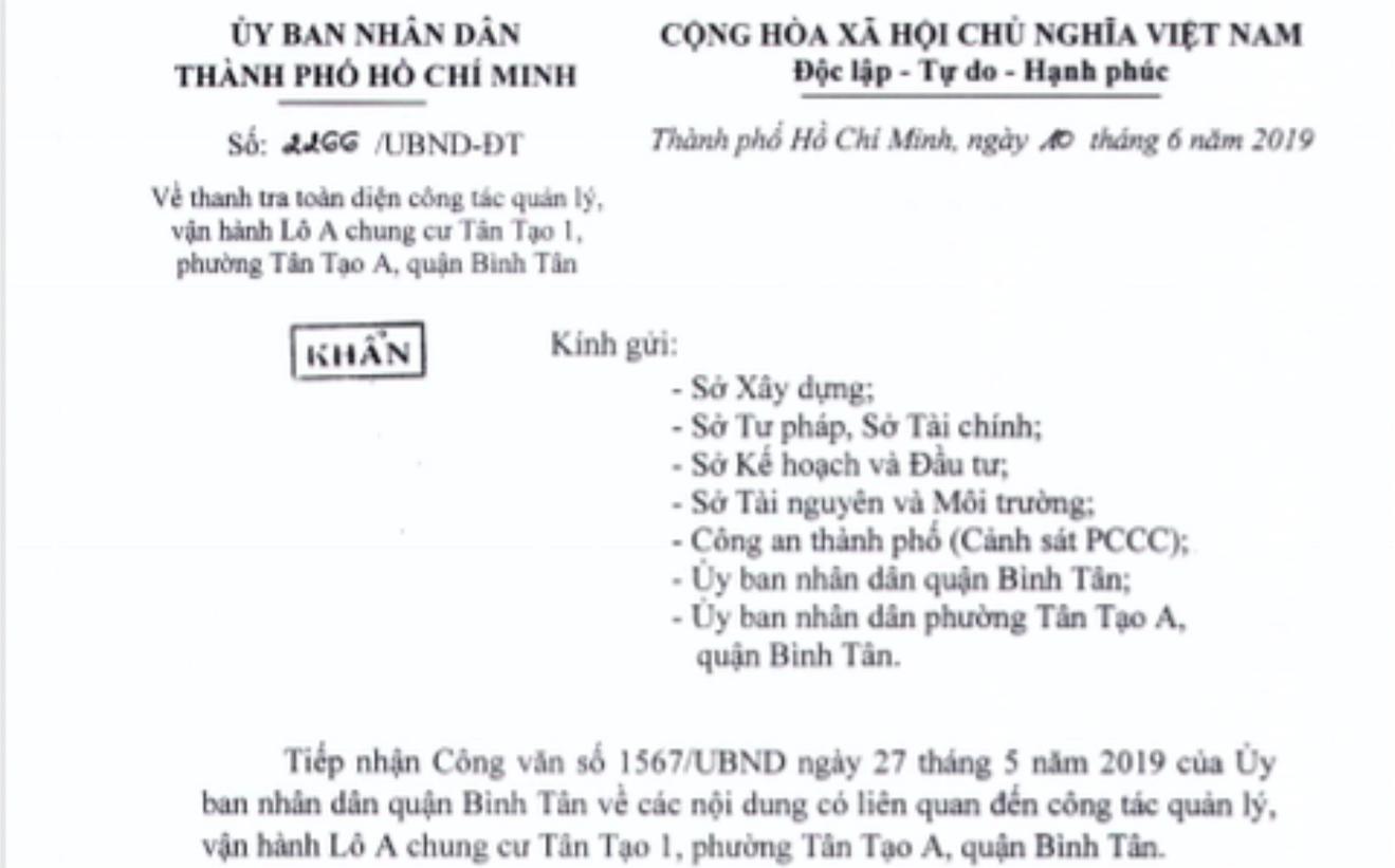 Theo đó, ông Trần Vĩnh Tuyến - Phó Chủ tịch UBND TP. HCM giao Sở Xây dựng khẩn trương chủ trì, phối hợp các cơ quan, đơn vị liên quan gồm Sở Tư pháp, Sở Tài chính, Sở Tài nguyên & Môi trường, Công an TP. HCM, UBND quận Bình Tân… thực hiện thanh tra toàn diện công tác quản lý, vận hành Lô A chung cư Tân Tạo 1, phường Tân Tạo A, quận Bình Tân để tổng hợp, báo cáo, đề xuất UBND TP xử lý vi phạm (nếu có) theo đúng quy định.