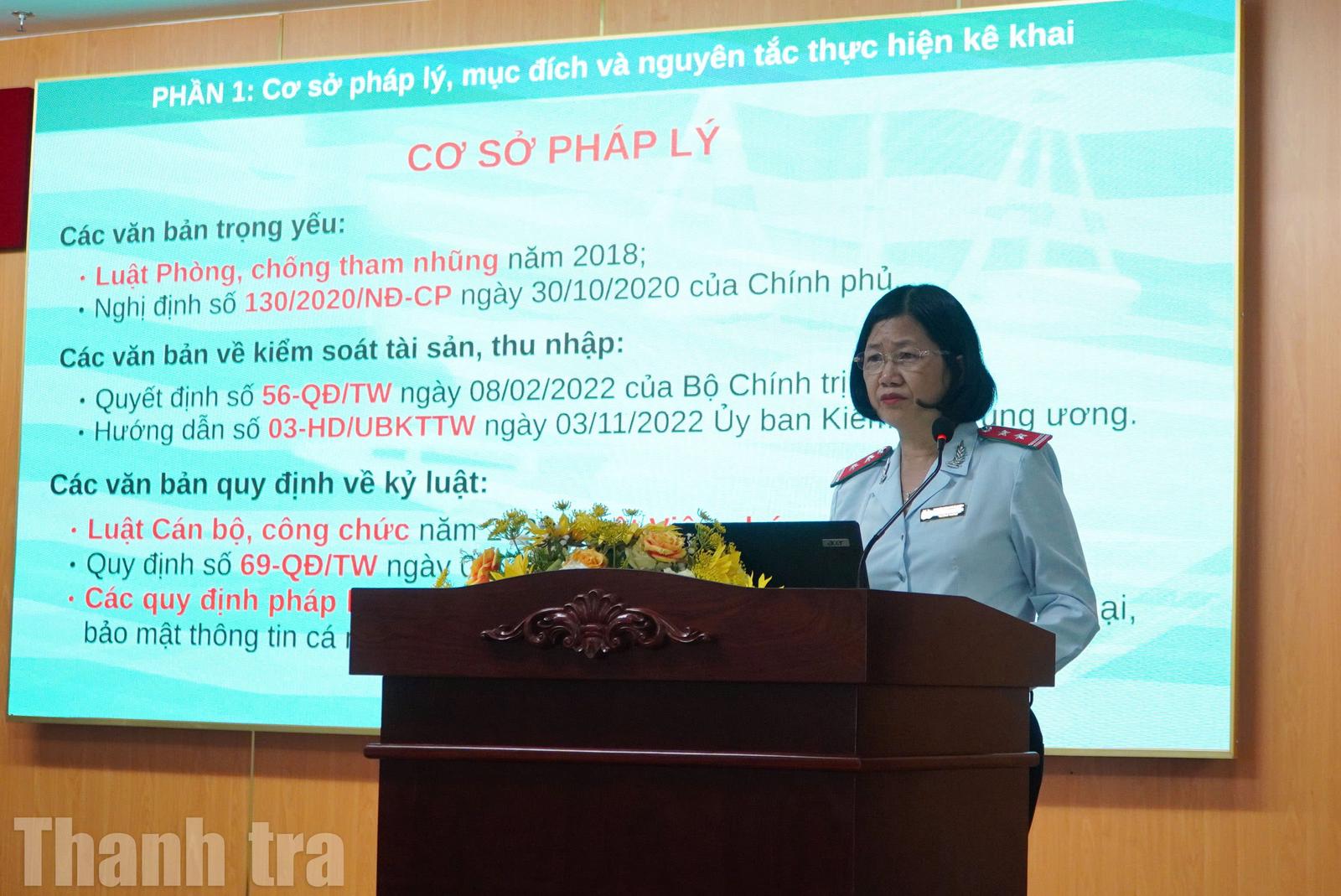 Bà Nguyễn Thị Kim Hằng, Trưởng phòng Thanh tra phòng, chống tham nhũng, lãng phí, tiêu cực giới thiệu các quy định pháp luật liên quan đến công tác kê khai tài sản, thu nhập. Ảnh: Nhật Huyền