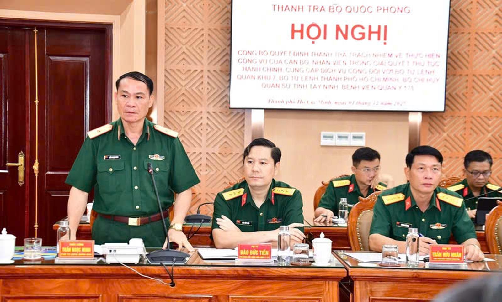 Ngày 1/12, Thanh tra Bộ Quốc phòng tổ chức Hội nghị công bố quyết định thanh tra trách nhiệm thực hiện công vụ của cán bộ, nhân viên trong giải quyết thủ tục hành chính và cung cấp dịch vụ công tại Bộ Tư lệnh Quân khu 7, Bộ Tư lệnh TP. Hồ Chí Minh, Bộ CHQS tỉnh Tây Ninh và Bệnh viện Quân y 175. Hội nghị do Thiếu tướng Nguyễn Văn Xiển, Phó Chánh Thanh tra Bộ Quốc phòng, chủ trì.