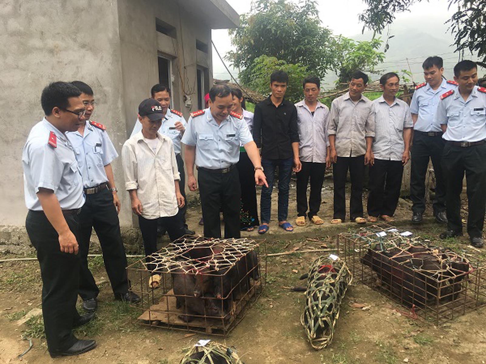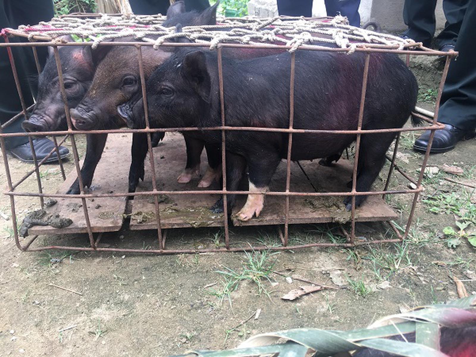 Đoàn công tác trao 10 con lợn nái sinh sản cho các hộ nghèo. Ảnh: Bùi Bình