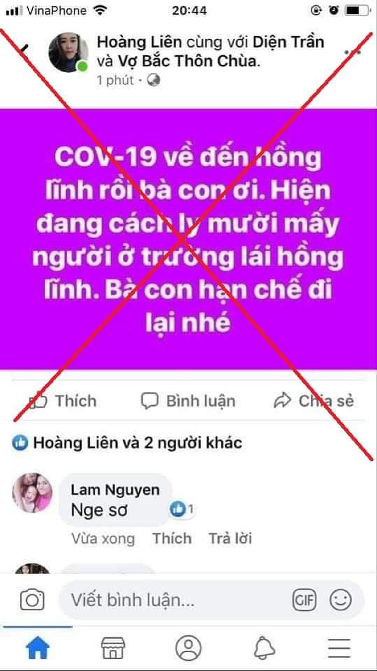 Trước đó, vào khoảng 20h43 phút tối ngày 8/3, Hoàng Liên đăng trên Facebook cá nhân với nội dung: “Covid - 19 về đến Hồng Lĩnh rồi bà con ơi. Hiện nay đang cách ly mười mấy người ở Trường lái Hồng Lĩnh. Bà con hạn chế đi lại nhé” và gắn tên 2 người bạn vào dòng trạng thái trên.