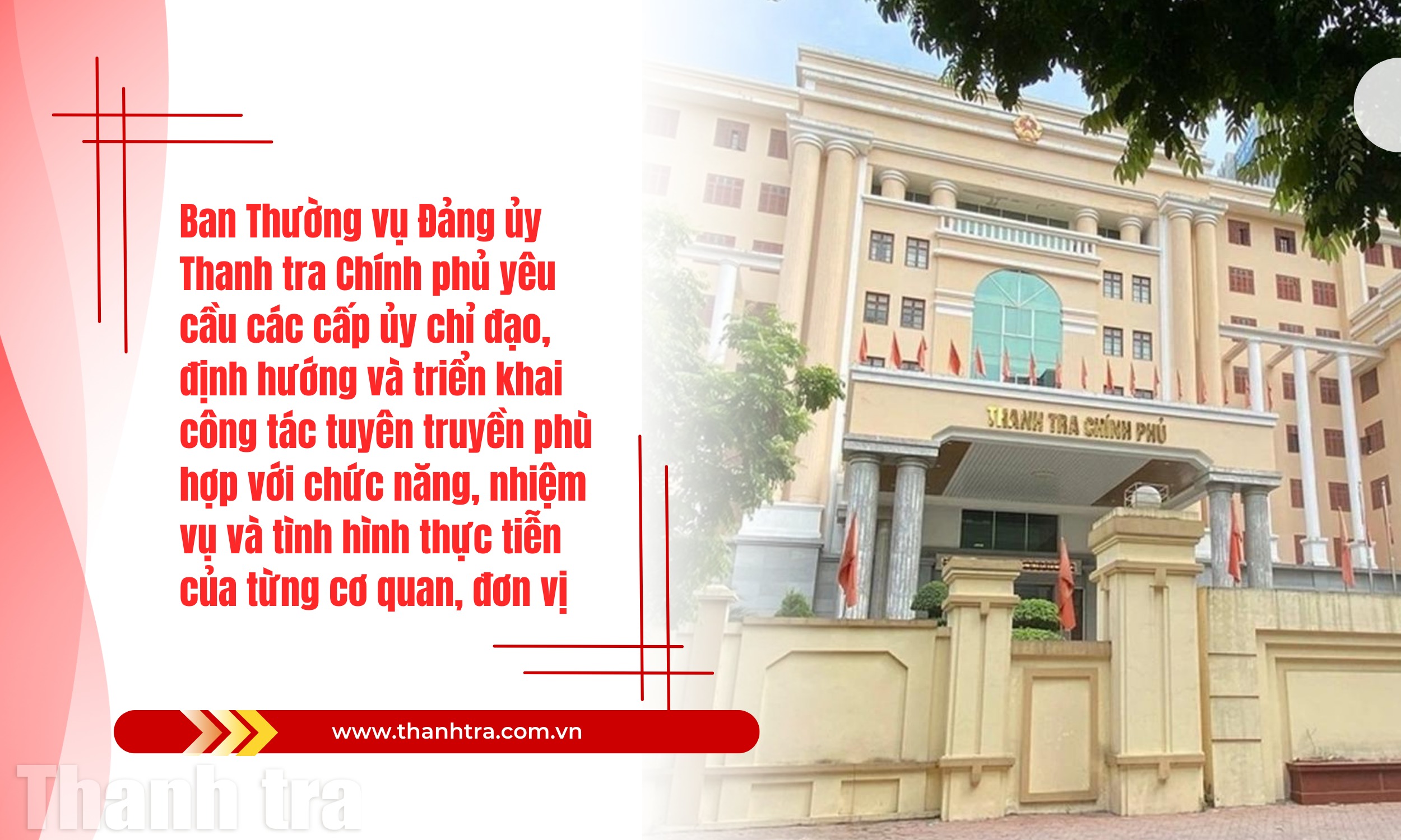 Ban Thường vụ Đảng ủy Thanh tra Chính phủ yêu cầu các cấp ủy chỉ đạo, định hướng và triển khai công tác tuyên truyền phù hợp với chức năng, nhiệm vụ và tình hình thực tiễn của từng cơ quan, đơn vị.