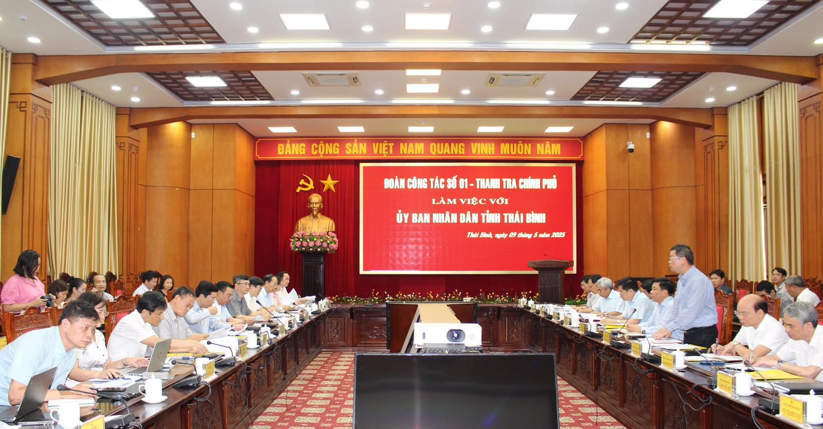 (Thanh tra) - Chiều ngày 9/5, Phó Tổng Thanh tra Chính phủ Dương Quốc Huy cùng Tổ Công tác số 01 của Thanh tra Chính phủ đã làm việc với tỉnh Thái Bình về nội dung kiểm tra, rà soát việc giải quyết các vụ việc khiếu nại (KN), tố cáo (TC) kéo dài trên địa bàn theo Kế hoạch số 96/KH-TTCP ngày 28/3/2025 của Thanh tra Chính phủ.