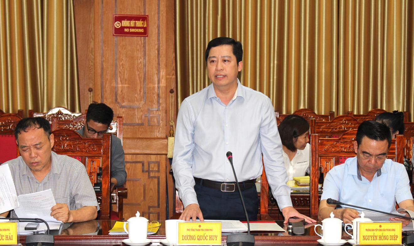 Kết luận buổi làm việc, Phó Tổng Thanh tra Chính phủ Dương Quốc Huy ghi nhận, đánh giá cao tỉnh Thái Bình đã nghiêm túc chấp hành chỉ đạo của đồng chí Tổng Bí thư Tô Lâm và của Thủ tướng Chính phủ. Tỉnh uỷ đã sớm thành lập tổ công tác, trực tiếp do đồng chí Bí thư Tỉnh uỷ làm Tổ trưởng để chỉ đạo rà soát, xử lý các vụ việc.