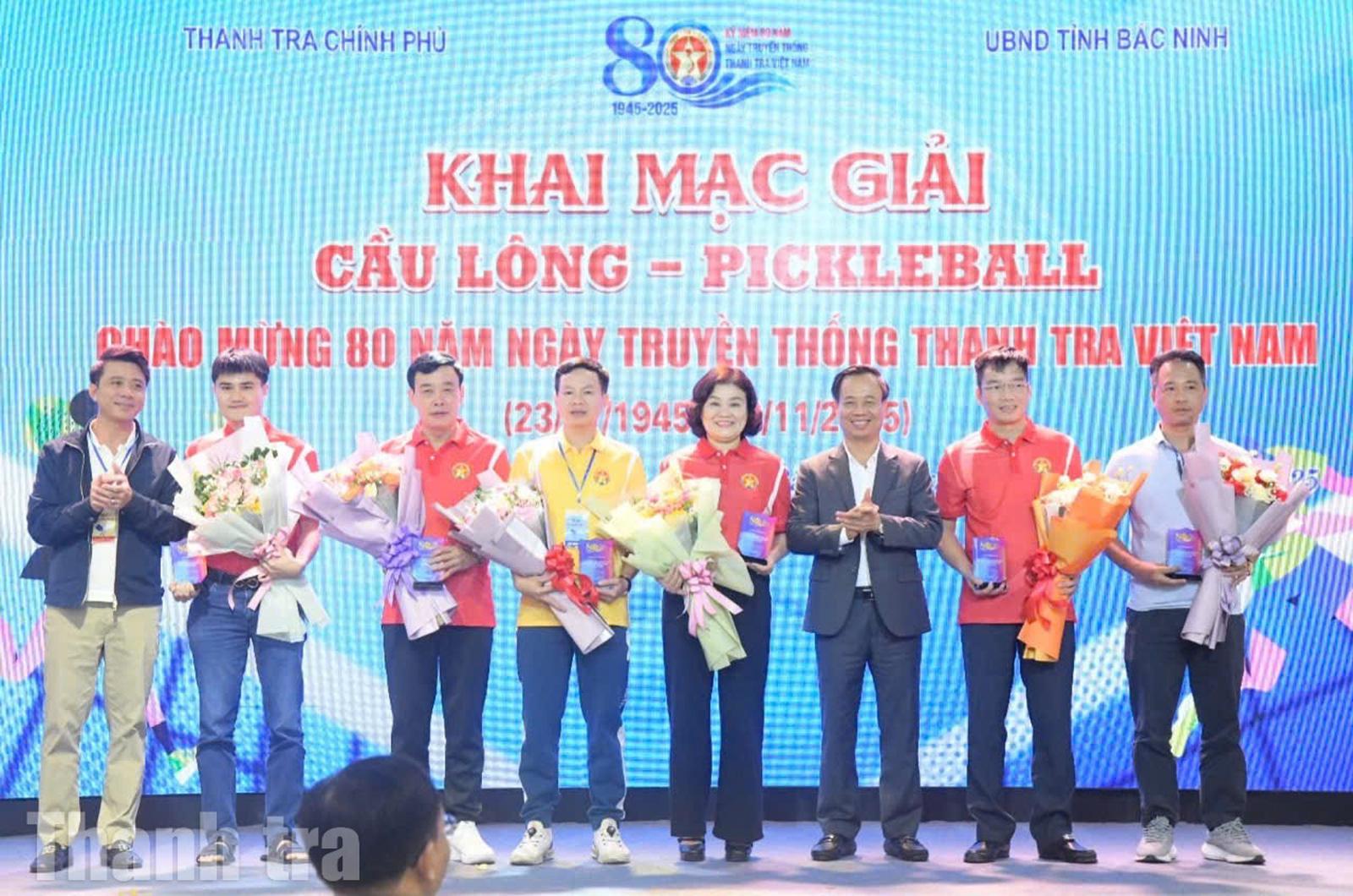 Phó Tổng Biên tập Báo Thanh tra Chu Văn Thủy (bìa trái) và Chánh Thanh tra tỉnh Bắc Ninh Đinh Đức Cảnh (thứ ba từ trái sang) tặng hoa và kỷ niệm chương cho các đoàn vận động viên, ghi nhận tinh thần tham gia hăng hái của các đơn vị.