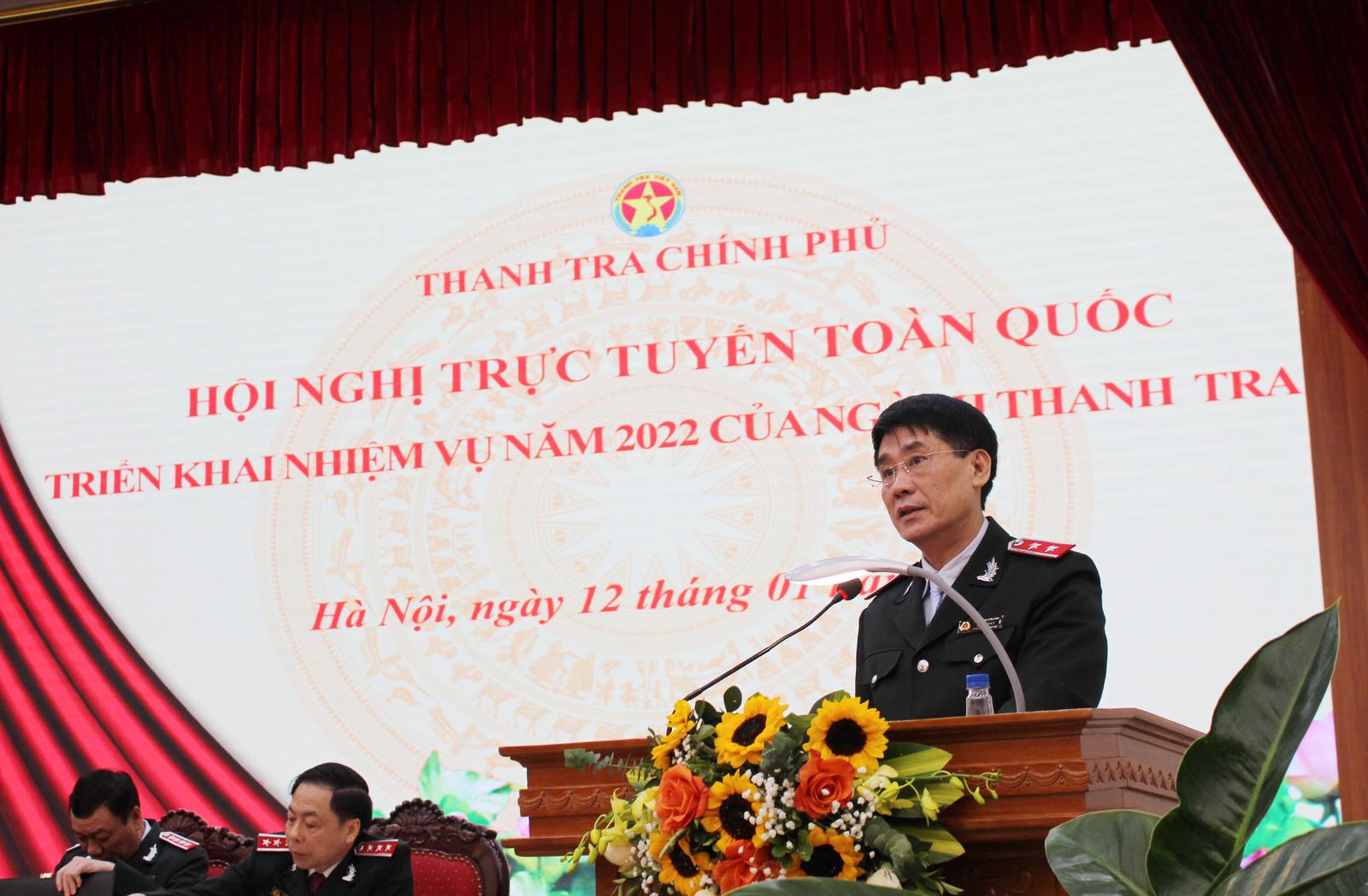 Phó Tổng Thanh tra Chính phủ Lê Sỹ Bảy trình bày báo cáo tổng kết công tác năm 2021 tại Hội nghị. Ảnh: LP