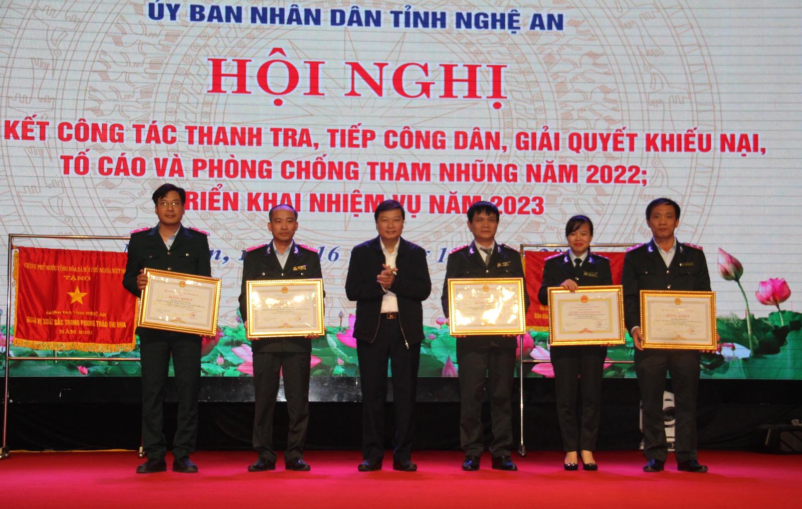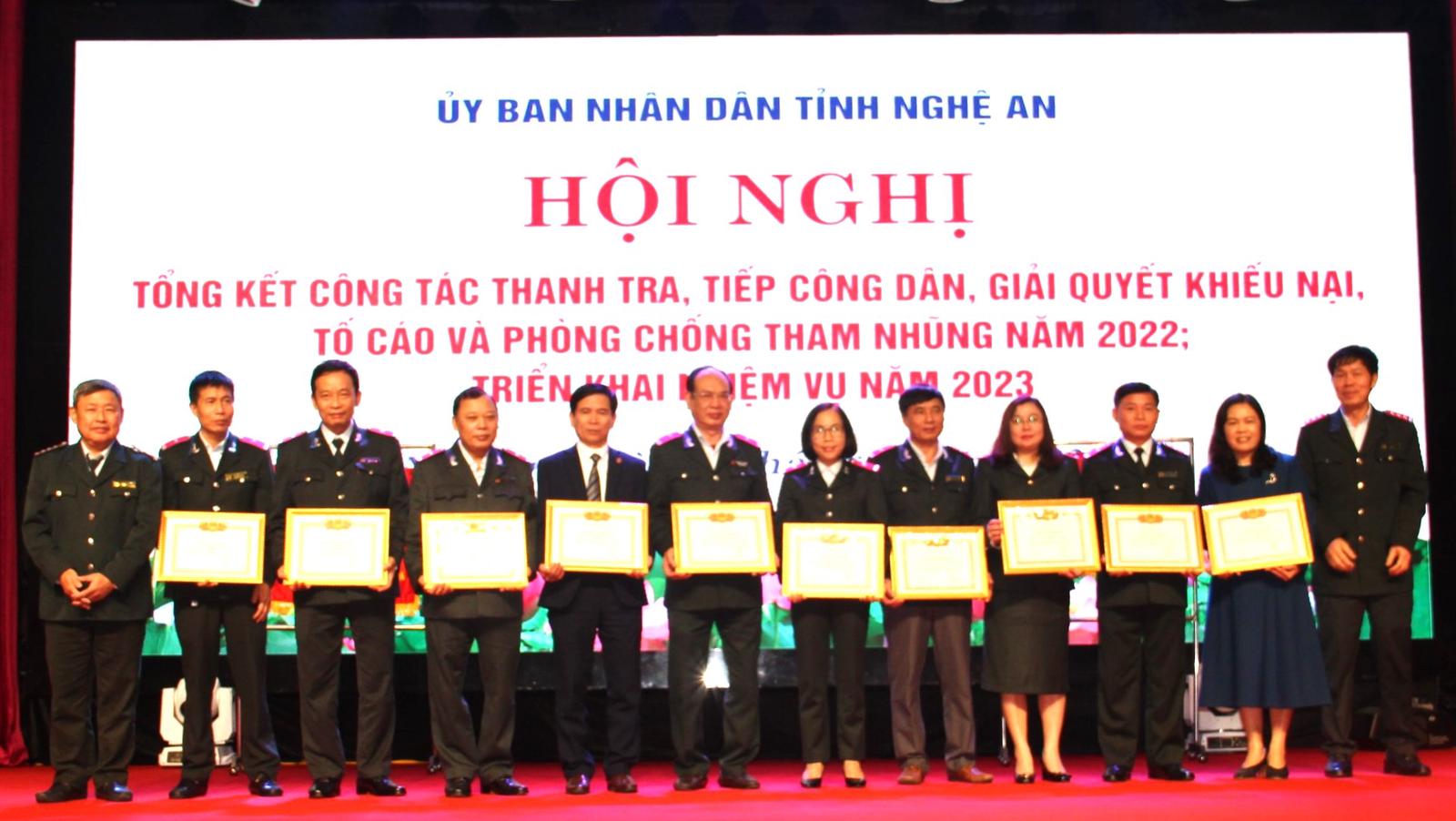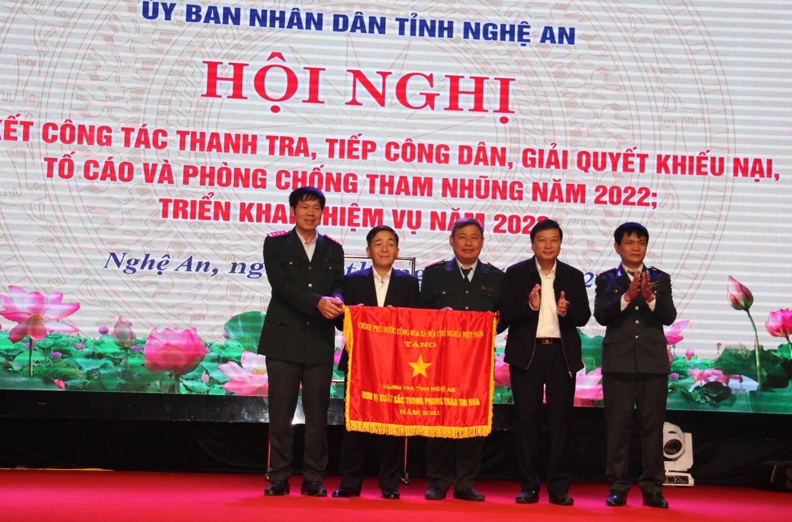 Thanh tra tỉnh Nghệ An nhận Cờ Thi đua của Thủ tướng Chính phủ tặng danh hiệu đơn vị xuất sắc phong trào thi đua năm 2022. Ảnh: XT