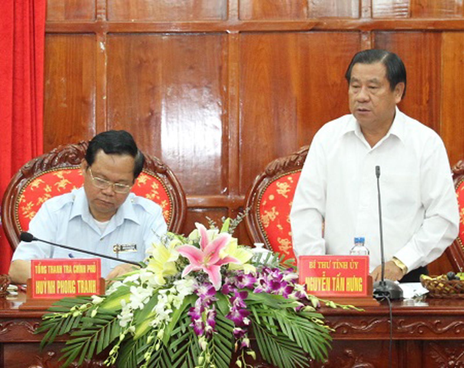 Bí thư Tỉnh ủy Bình Phước Nguyễn Tấn Hưng kiến nghị 5 nội dung với Tổng Thanh tra Chính phủ Huỳnh Phong Tranh. Ảnh: Ngọc Giang