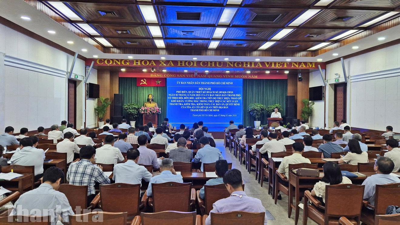 (Thanh tra) - Chiều ngày 7/1, UBND TP Hồ Chí Minh tổ chức hội nghị phổ biến, quán triệt Kế hoạch số 185/KH-UBND ngày 2/12/2025 về theo dõi, đôn đốc, kiểm tra tiến độ thực hiện, tháo gỡ khó khăn, vướng mắc trong thực hiện các kết luận thanh tra, kiểm tra, kiểm toán, các bản án, quyết định của tòa án có liên quan trên địa bàn TP.