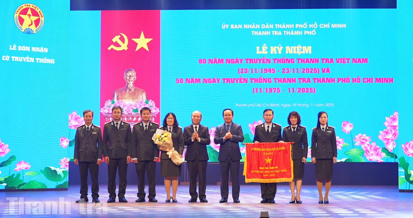 Lãnh đạo UBND TP Hồ Chí Minh trao Cờ truyền thống của UBND TP Hồ Chí Minh cho tập thể Thanh tra TP. Ảnh: Cảnh Nhật