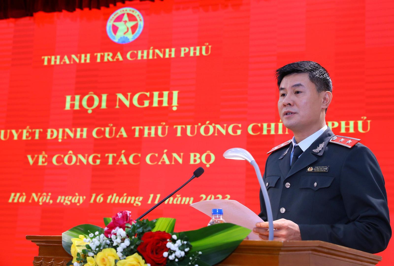 Tại hội nghị, Vụ trưởng Vụ Tổ chức Cán bộ Nguyễn Hữu Hòa đã đọc Quyết định 1368/QĐ-TTg ngày 14/11/2023 về việc điều động, bổ nhiệm ông Nguyễn Văn Cường, trợ lý đồng chí Vương Đình Huệ, Ủy viên Bộ Chính trị, Chủ tịch Quốc hội giữ chức Phó Tổng Thanh tra Chính phủ.