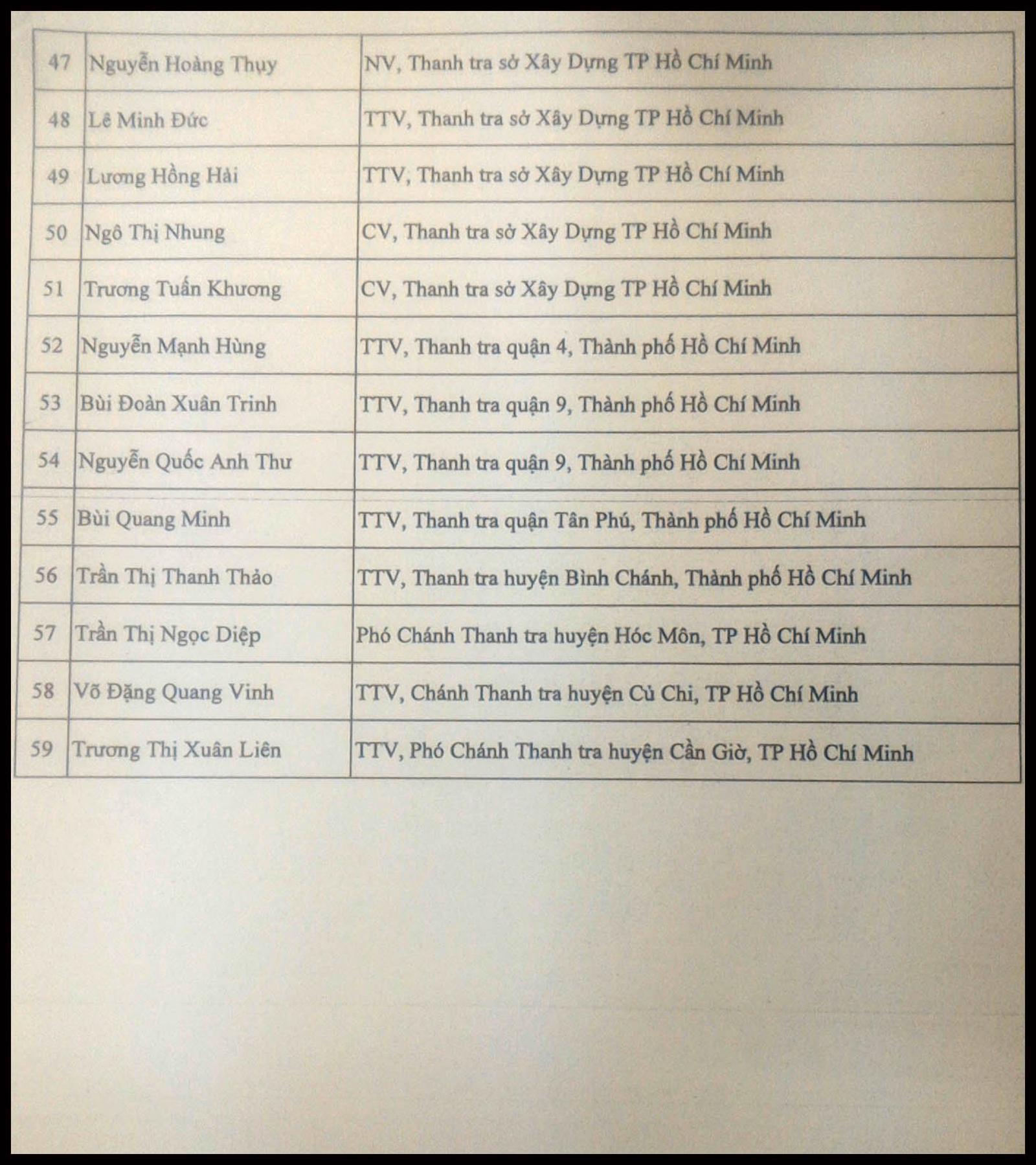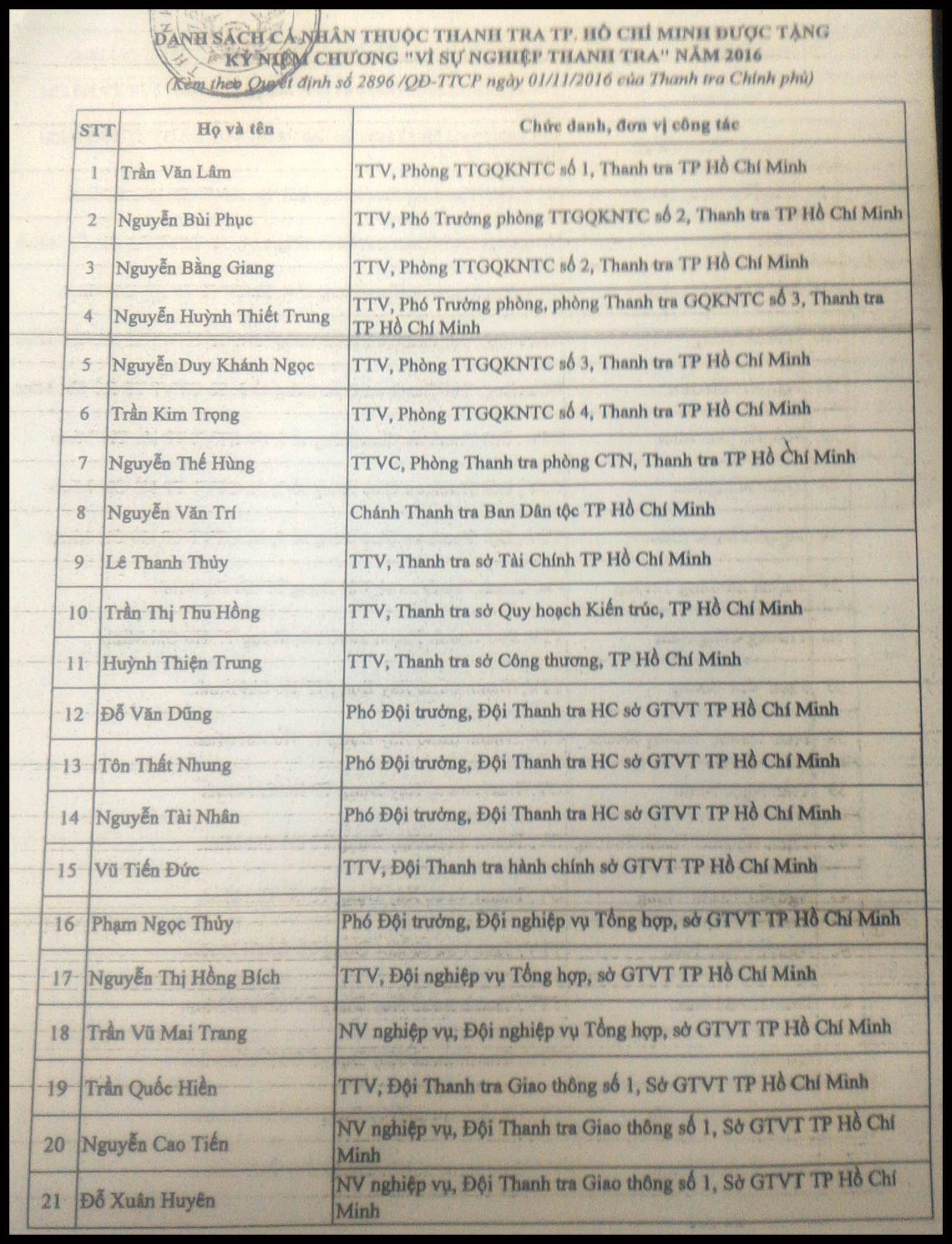 Dưới đây là danh sách các cá nhân được trao tặng Kỷ niệm chương "Vì sự nghiệp Thanh tra":