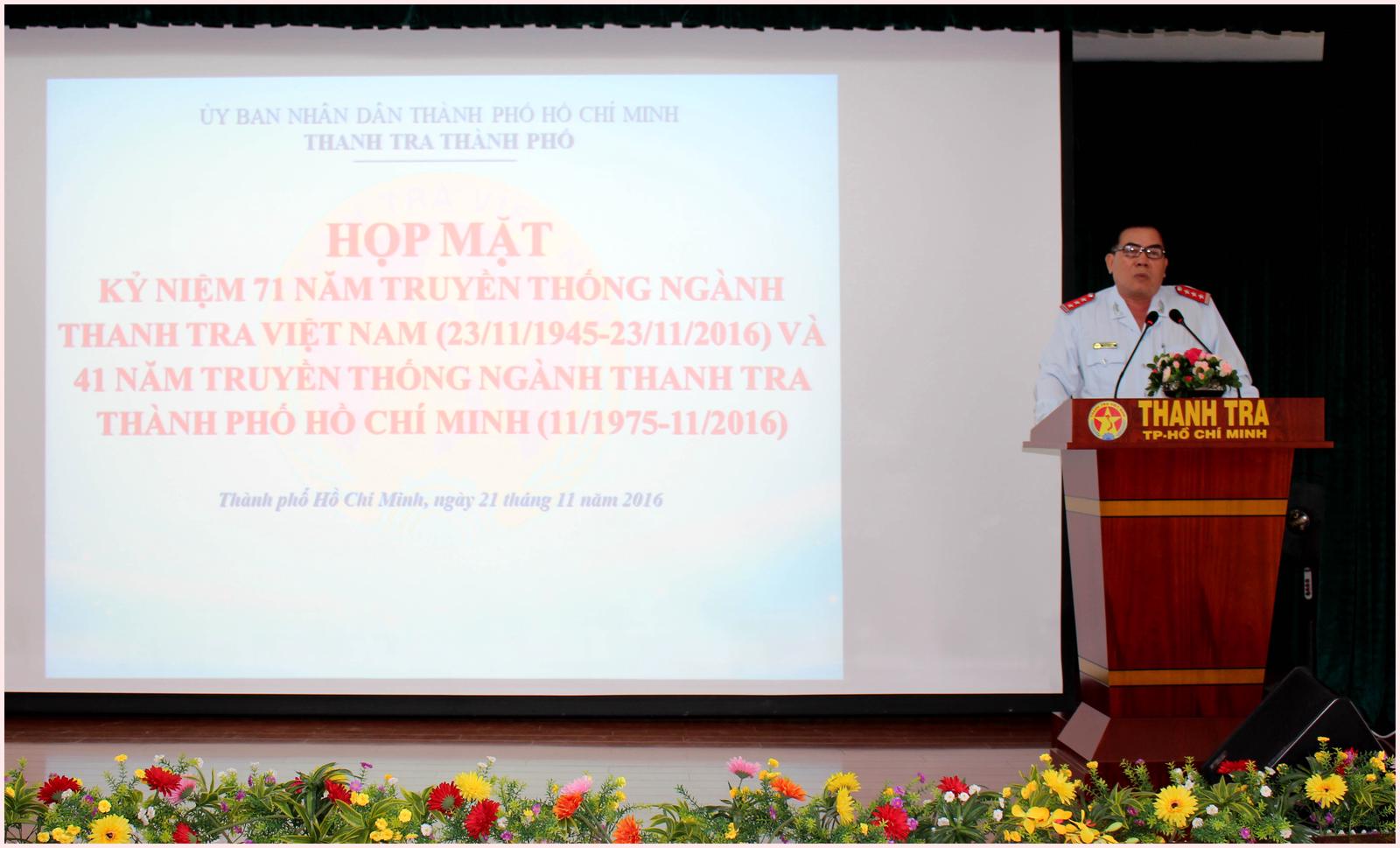 Ôn lại truyền thống của ngành, Phó Chánh Thanh tra TP Lê Văn Hùng phát biểu: “41 năm qua, dưới sự lãnh đạo của Thành ủy, UBND TP, ngành Thanh tra TP đã không ngừng trưởng thành và có những bước phát triển vượt bậc, vị thế và uy tín ngày càng được nâng cao trong toàn ngành cũng như với Đảng bộ, chính quyền và nhân dân TP, góp phần xứng đáng vào quá trình xây dựng, phát triển của ngành Thanh tra, của công cuộc xây dựng và phát triển TP Hồ Chí Minh.