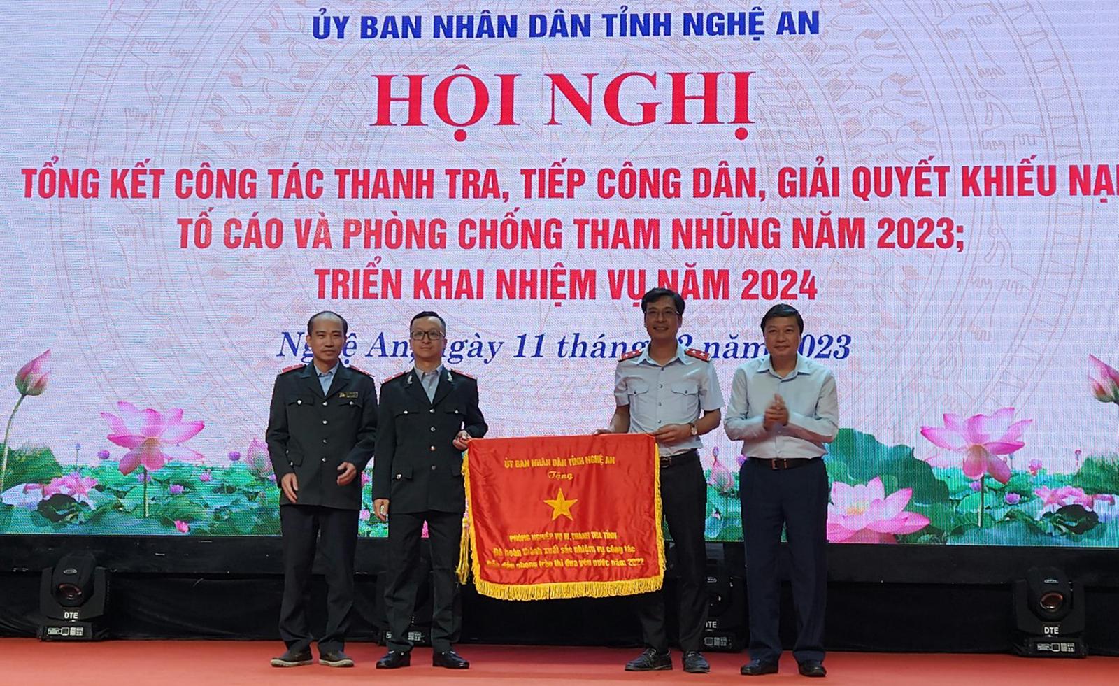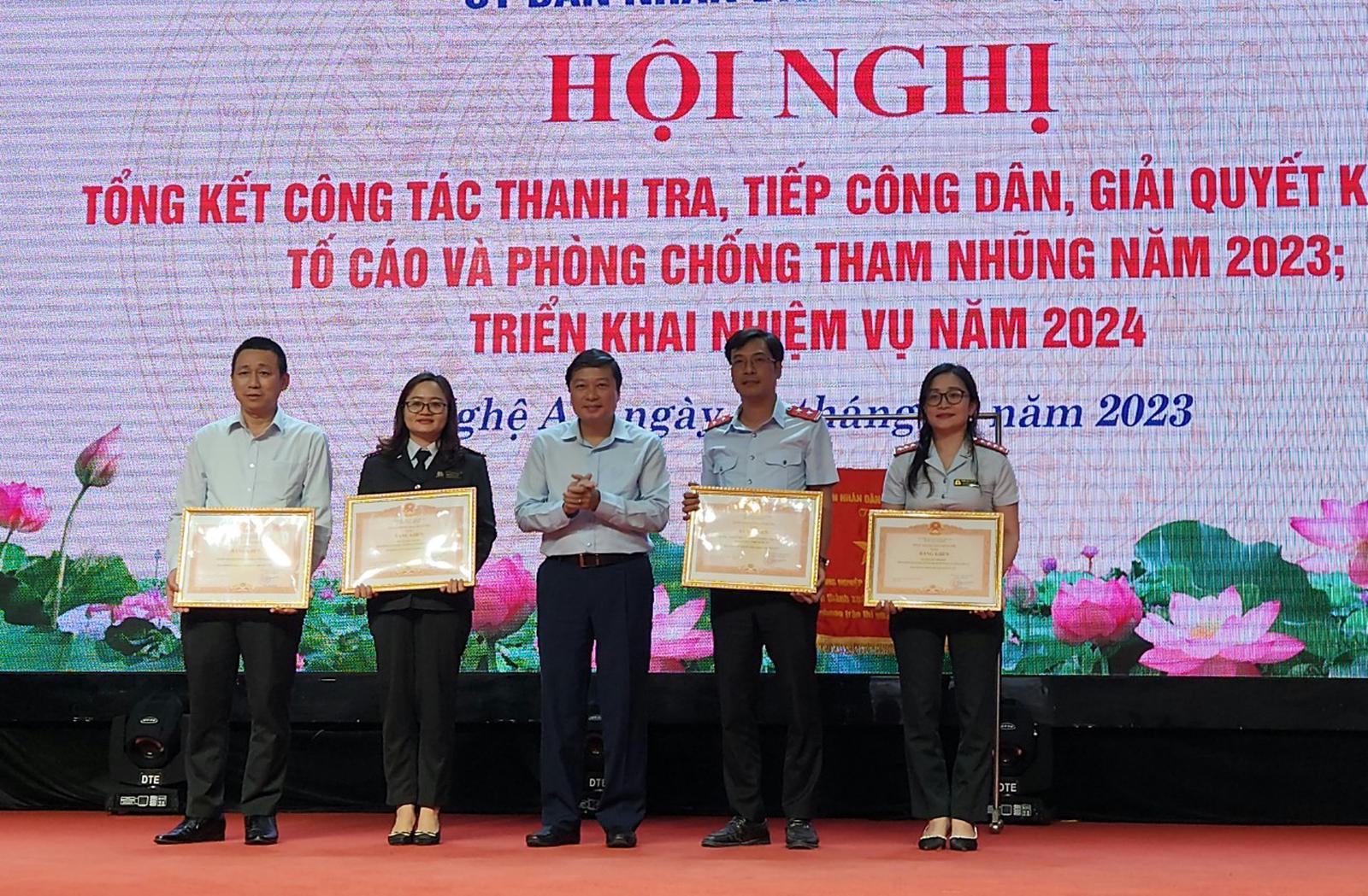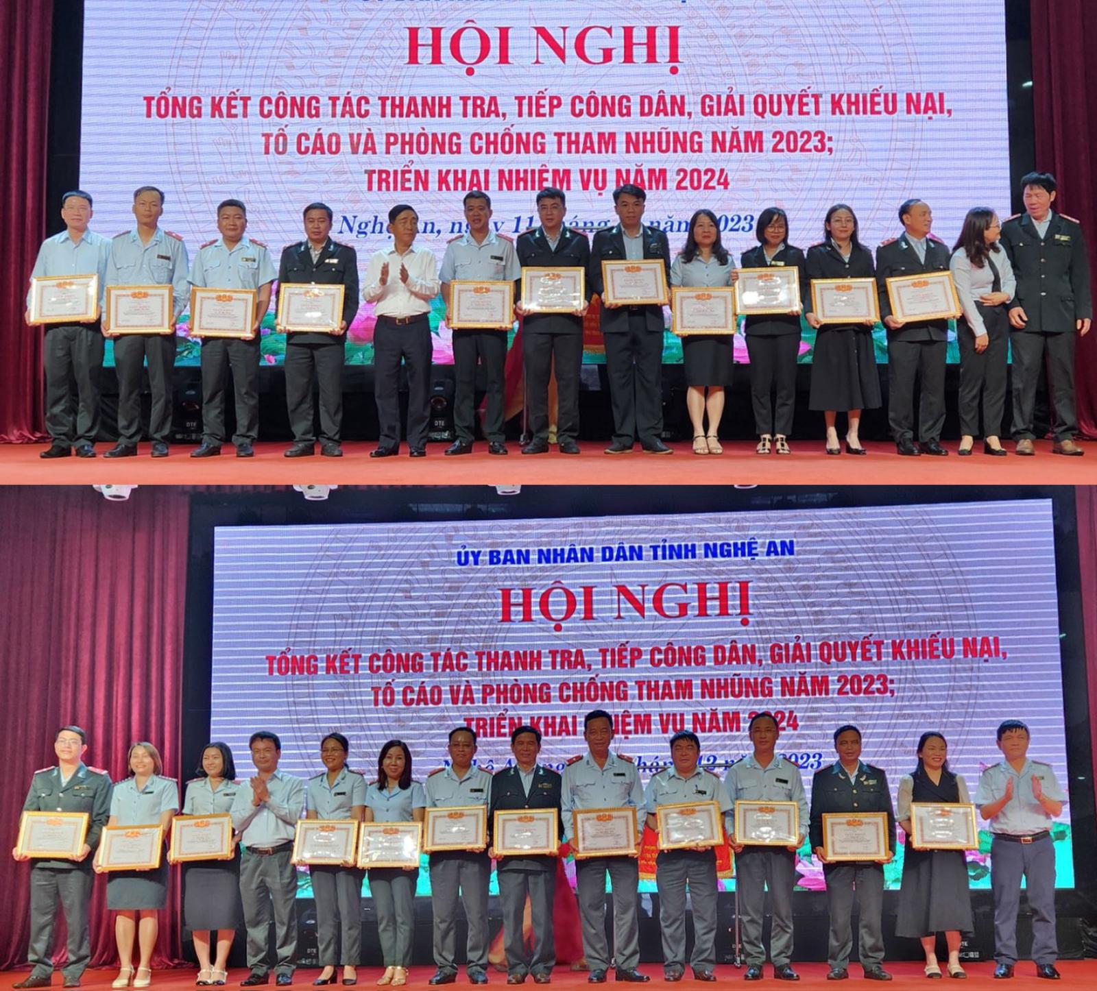 Tại hội nghị tổng kết, UBND tỉnh Nghệ An đã tặng Cờ Thi đua cho 95 tập thể đã hoàn thành xuất sắc nhiệm vụ công tác, dẫn đầu phong trào thi đua yêu nước năm 2022; tặng Bằng khen của Tổng Thanh tra Chính phủ cho 79 tập thể và 128 cá nhân thuộc Thanh tra tỉnh; Chủ tịch UBND tỉnh tặng danh hiệu tập thể lao động xuất sắc năm 2023 cho Phòng Giám sát, kiểm tra, xử lý sau thanh tra, tặng bằng khen cho 4 cá nhân thuộc Thanh tra tỉnh đã có thành tích xuất sắc trong công tác từ năm 2022- 2023.
