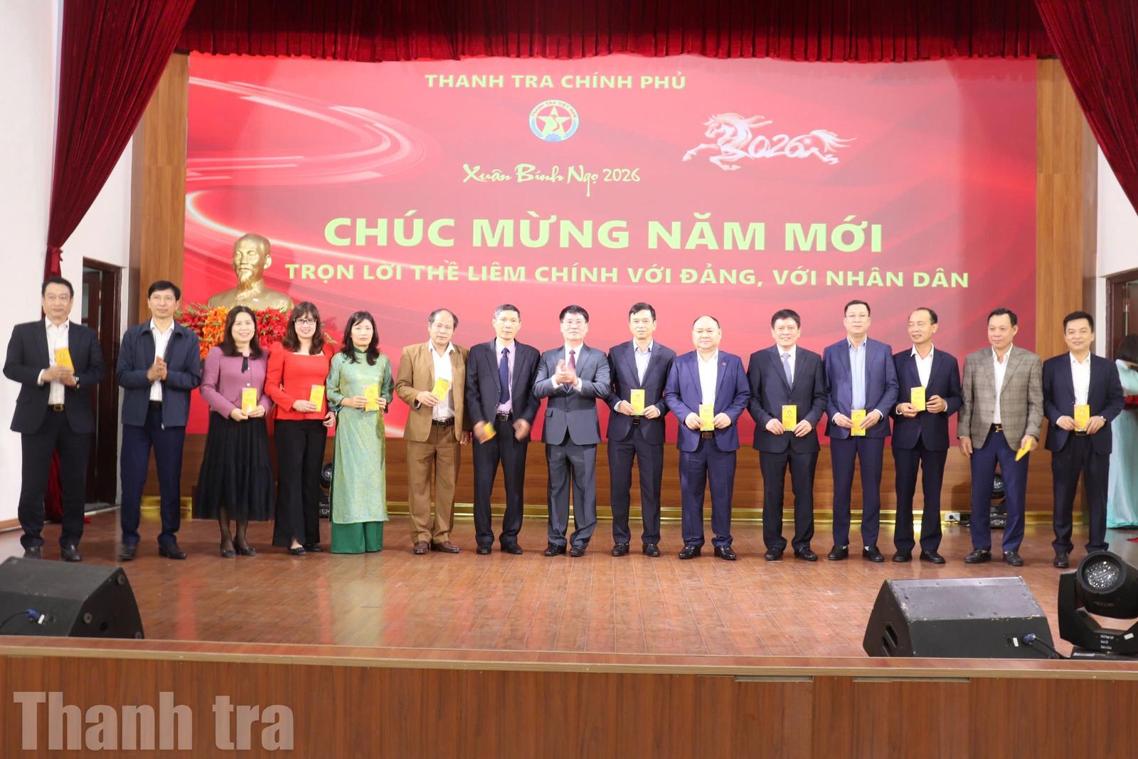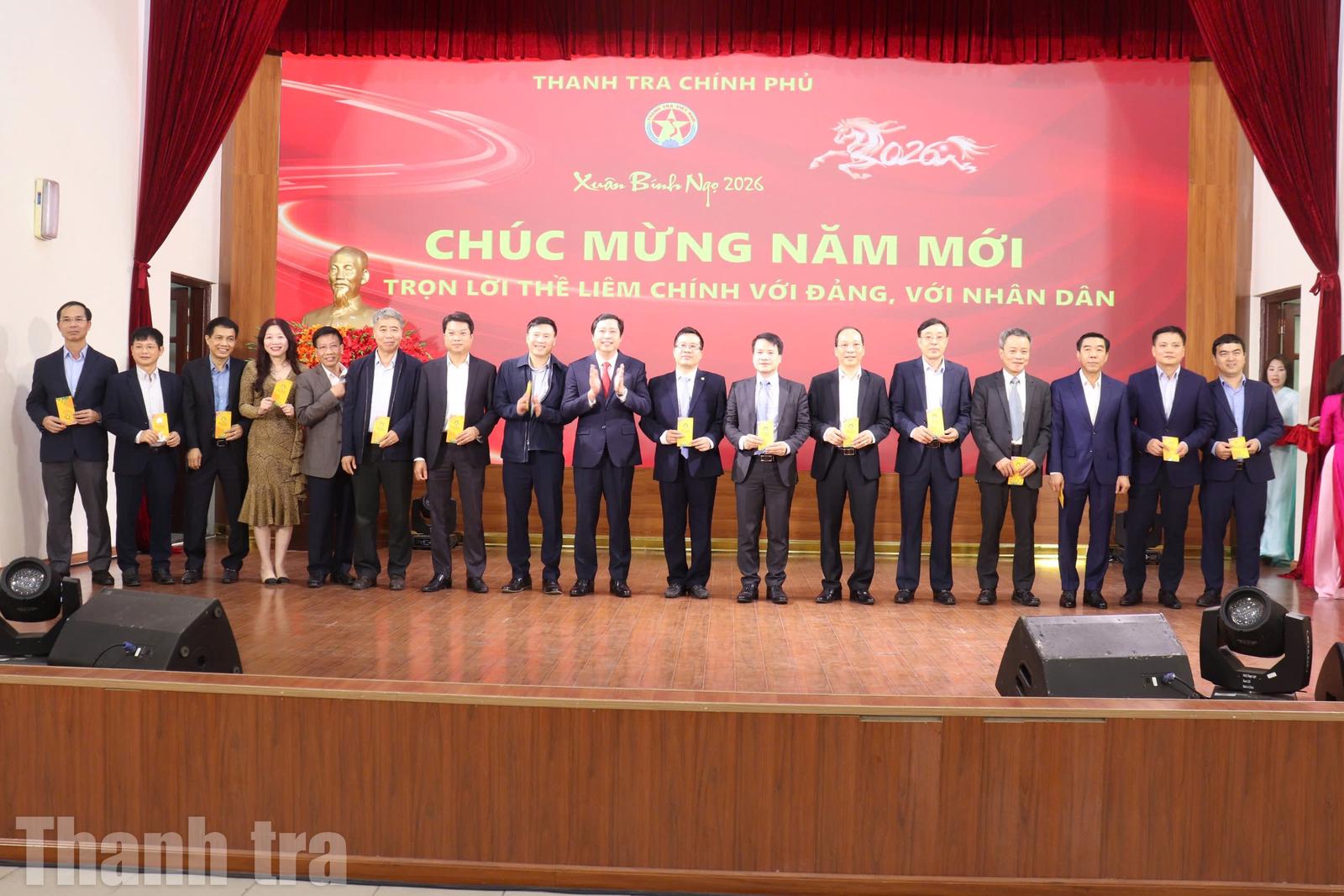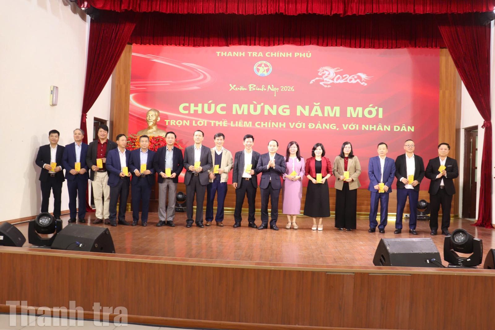 Trên nền phông đỏ “Xuân Bính Ngọ 2026”, lãnh đạo Thanh tra Chính phủ trao những phong bao lì xì đầu năm tới đại diện các cục, vụ, đơn vị. Hình ảnh giản dị nhưng mang ý nghĩa động viên tinh thần, khởi đầu năm công tác mới với quyết tâm, trách nhiệm và kỷ cương.