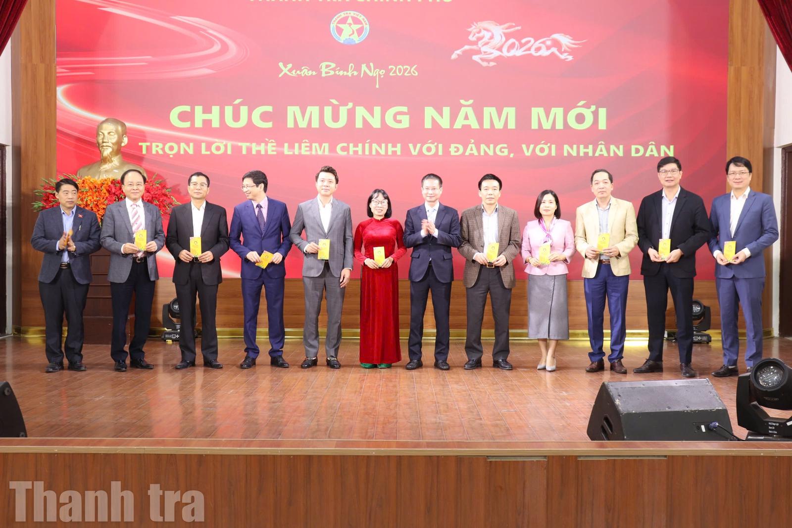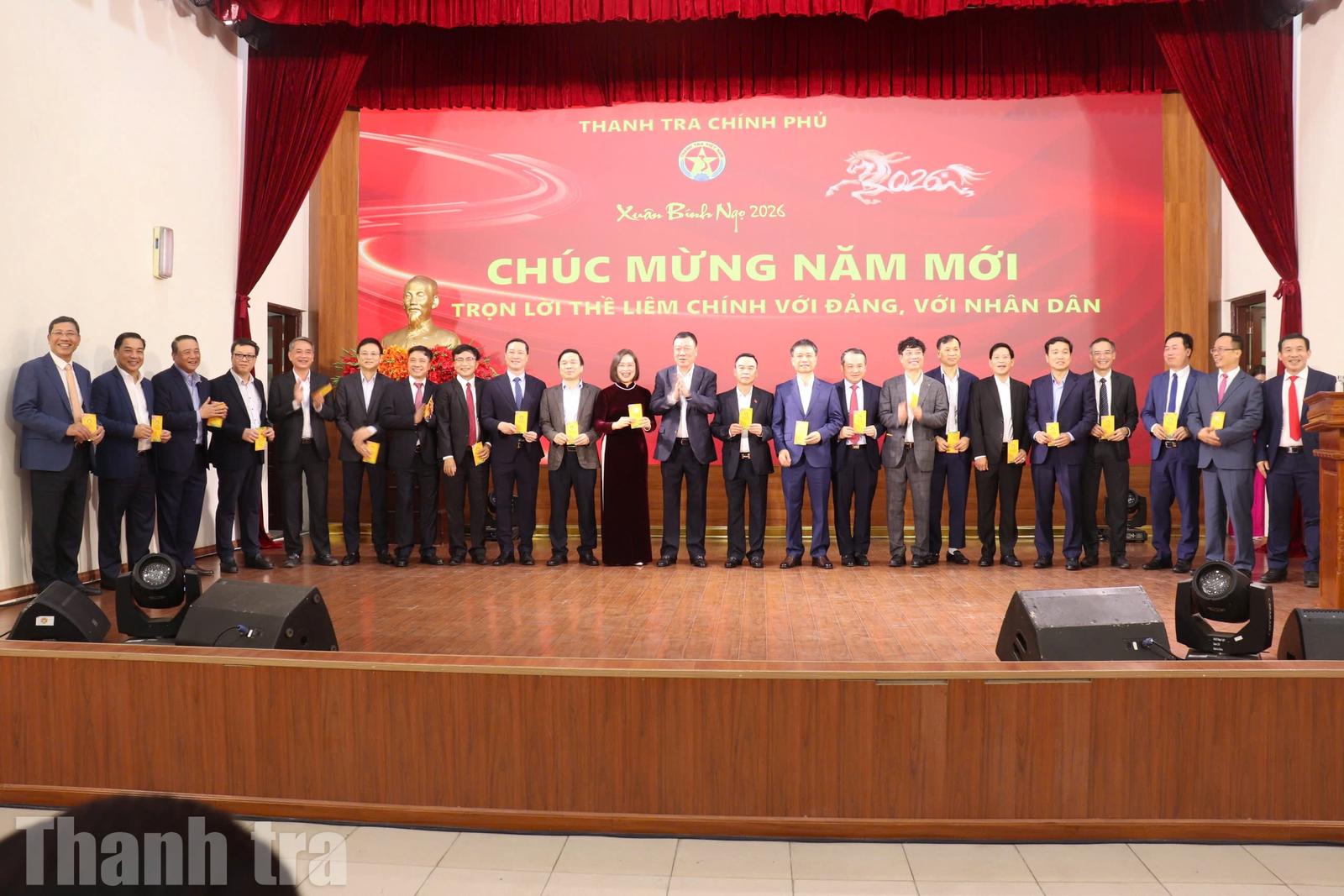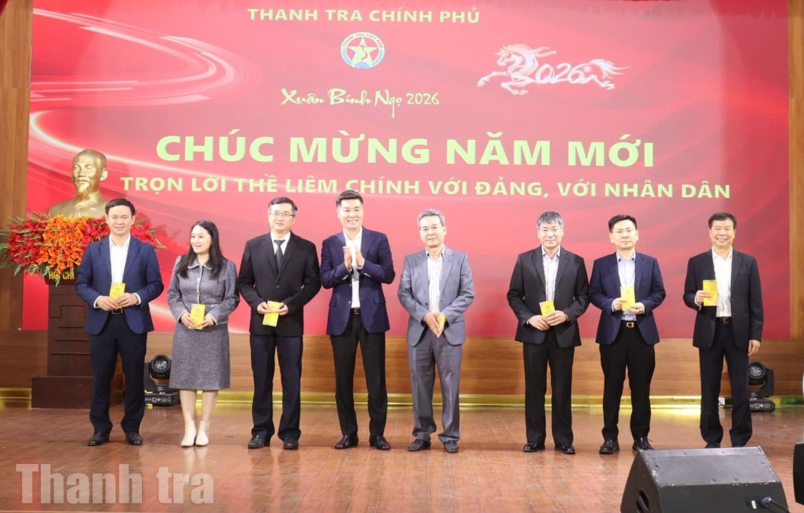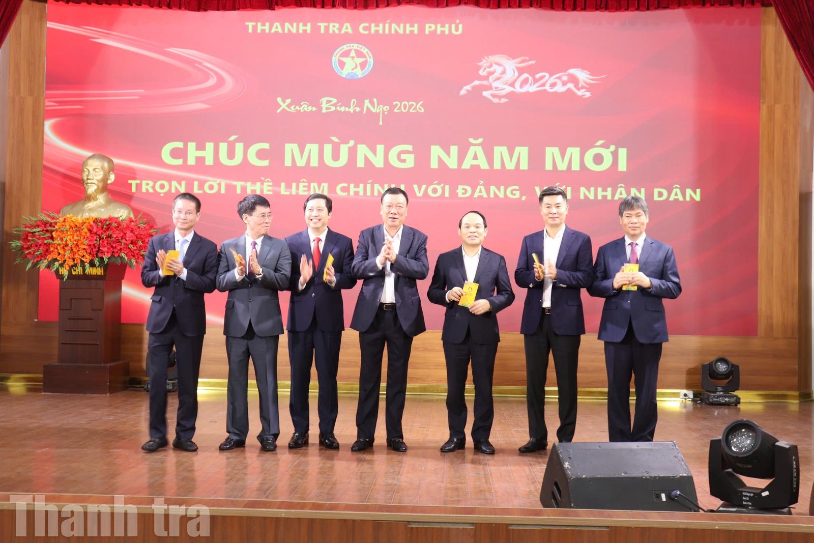 Trên nền phông đỏ “Xuân Bính Ngọ 2026”, lãnh đạo Thanh tra Chính phủ trao những phong bao lì xì đầu năm tới đại diện các cục, vụ, đơn vị. Hình ảnh giản dị nhưng mang ý nghĩa động viên tinh thần, khởi đầu năm công tác mới với quyết tâm, trách nhiệm và kỷ cương.