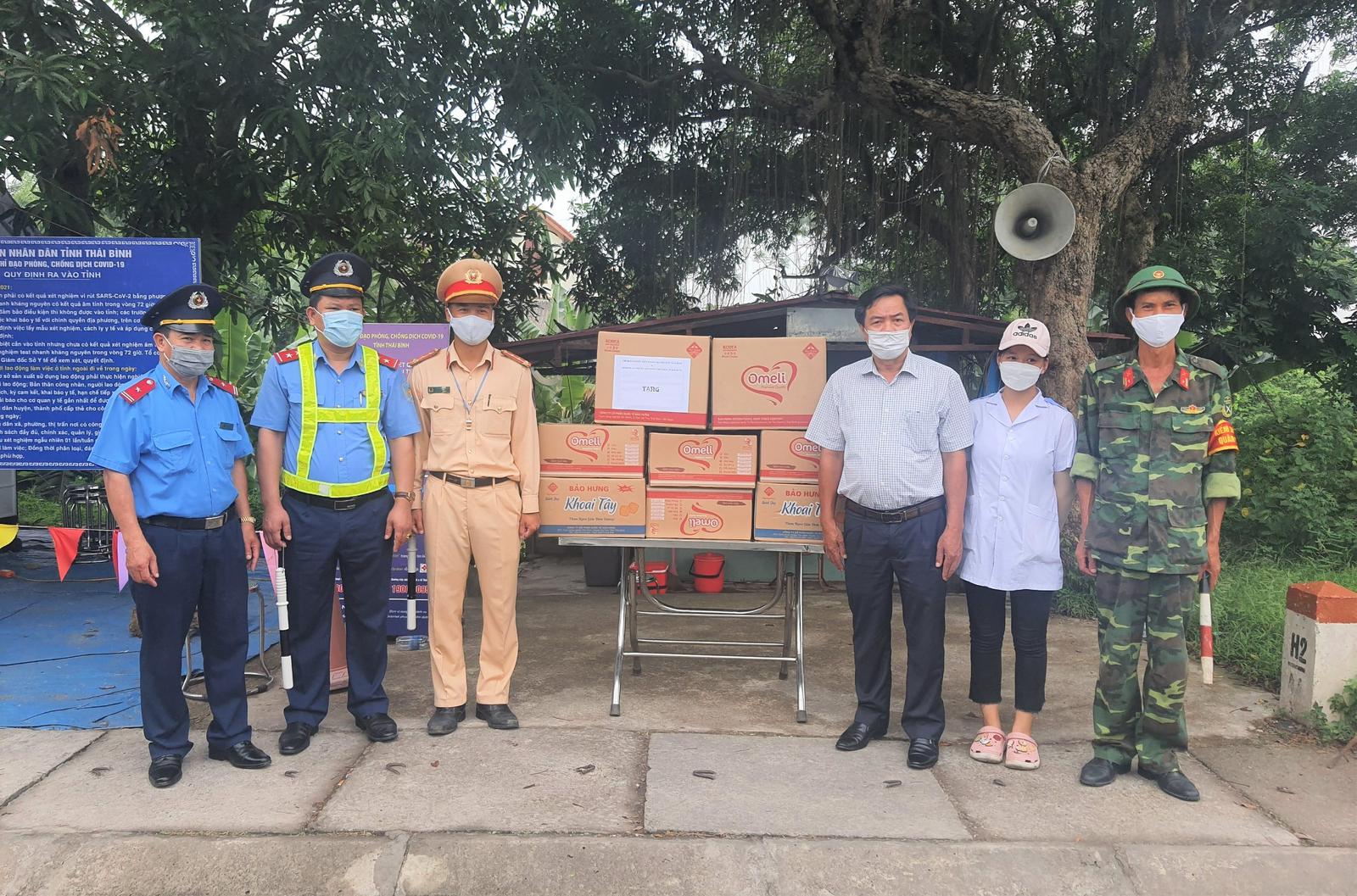 Đại diện lãnh đạo Sở GTVT Thái Bình thăm, tặng quà, động viên lực lượng kiểm soát dịch tại các chốt liên ngành. Ảnh: P.V