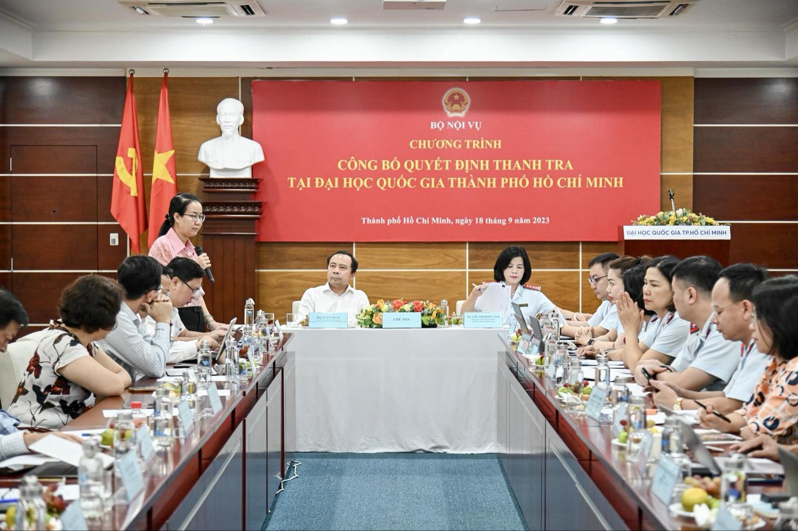 Phó Chánh Thanh tra Bộ Nội vụ Chu Thị Hồng Tâm chủ trì buổi công bố quyết định thanh tra tại Đại học Quốc gia Hồ Chí Minh. Ảnh: Thanh tra Bộ Nội vụ