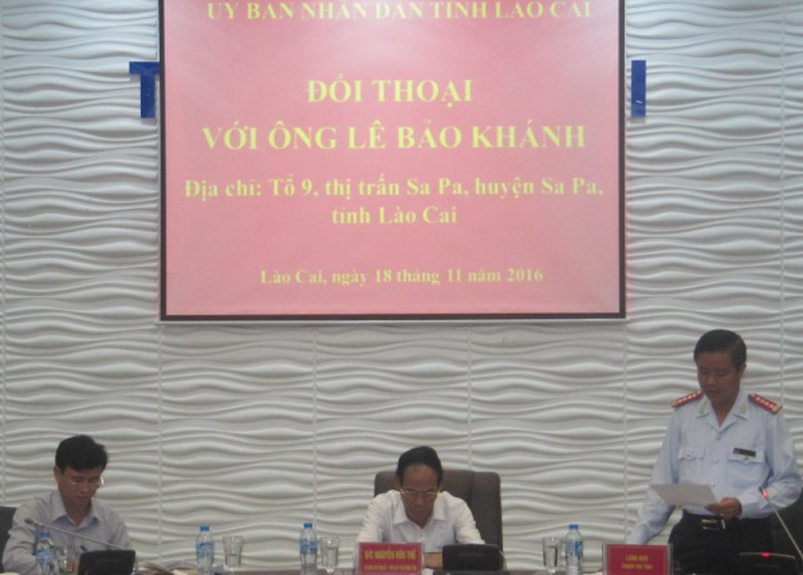 Tại buổi đối thoại, ông Lê Bảo Khánh cho rằng việc UBND huyện Sa Pa thu hồi 4.089 m2 đất tại tổ 11A, thị trấn Sa Pa để xây dựng Trường Nội trú liên thông THCS và THPT là sai quy định. Cụ thể: Không có quy hoạch sử dụng đất chi tiết của công trình; diện tích đất thu hồi của gia đình nằm ngoài diện tích của rừng phòng hộ 661 và ngoài diện tích xây dựng trường nhưng vẫn tiến hành thu hồi; các quy trình thu hồi đất, các biên bản liên quan không khớp về mặt thời gian. Chính quyền địa phương mang bản đồ chi tiết của dự án khác “chụp” lên dự án trường nội trú; đây không phải là dự án cấp bách…