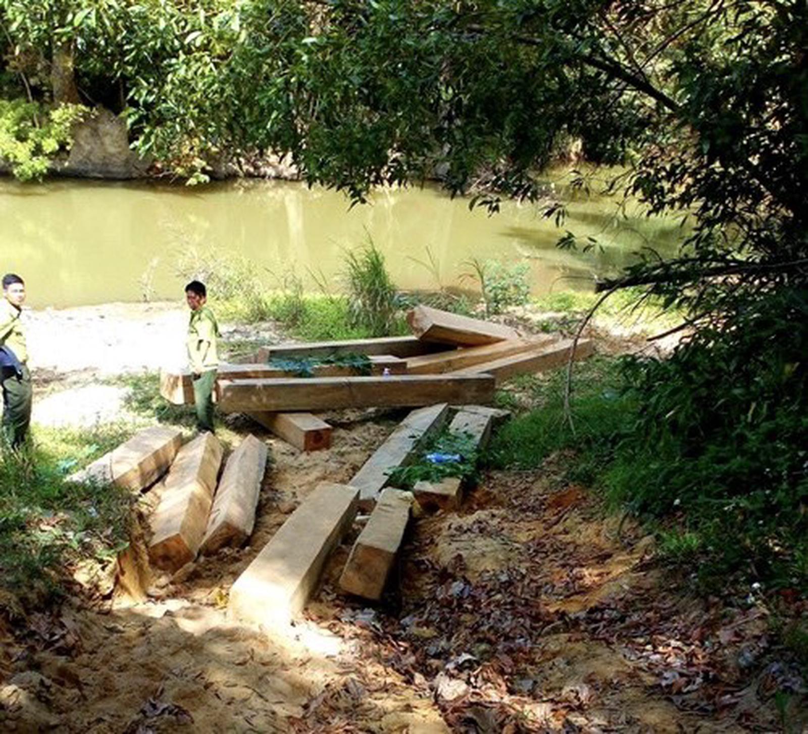 Lâm tặc tập kết gỗ bên bờ suối trong một vụ phá rừng tại huyện M'đrắk. Ảnh: AM