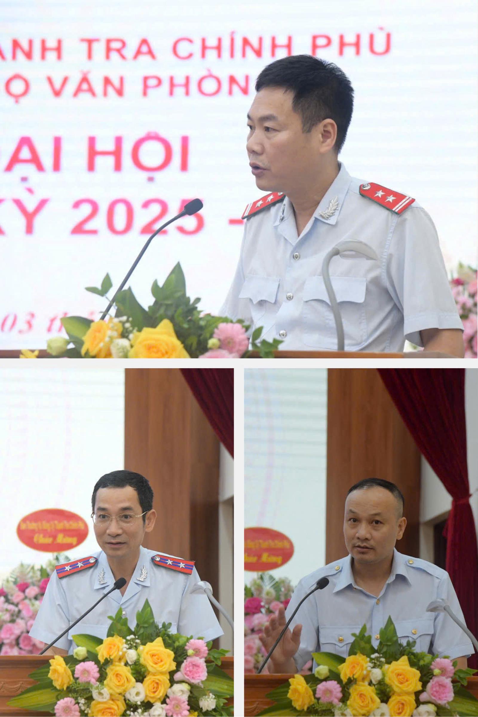 Đại hội cũng dành thời gian để thảo luận, đóng góp ý kiến vào các văn kiện của Đảng bộ Thanh tra Chính phủ và các dự thảo văn kiện trình Đại hội XIV của Đảng. Các tham luận tập trung vào các giải pháp nâng cao hiệu quả công tác Đảng trong cơ quan hành chính; đổi mới nội dung sinh hoạt chi bộ; ứng dụng công nghệ trong công tác văn thư, lưu trữ, điều hành tác nghiệp và phát huy vai trò nêu gương của cán bộ, đảng viên Văn phòng.