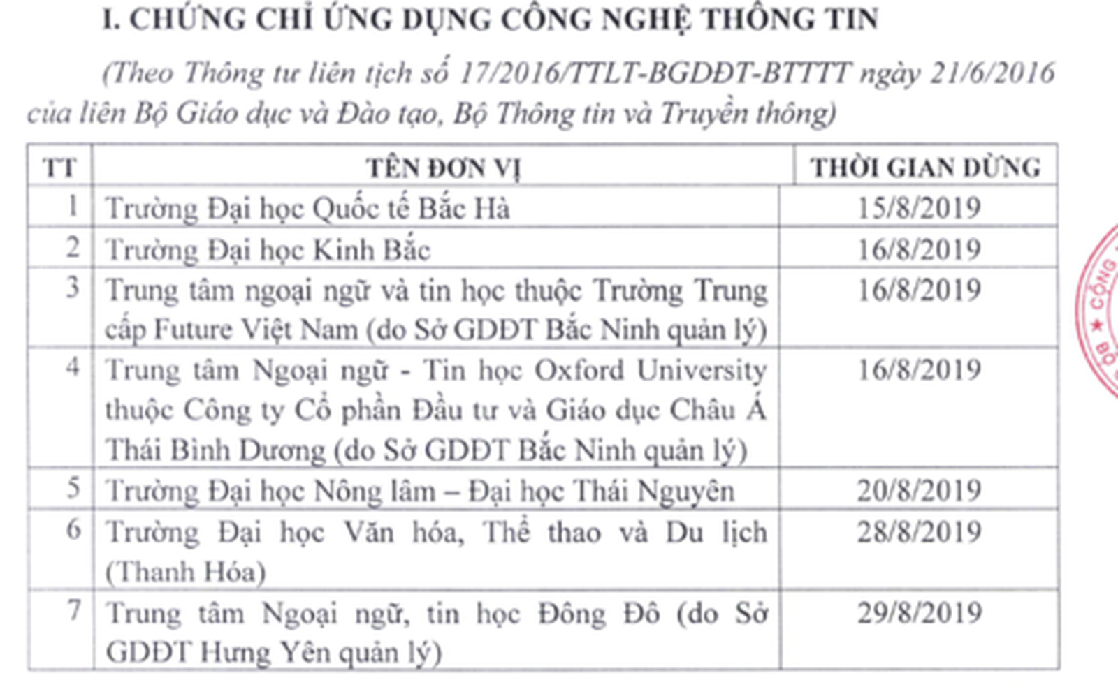 7 đơn vị phải dừng kiểm tra, sát hạch, cấp chứng chỉ ứng dụng công nghệ thông tin theo thông tư liên tịch giữa Bộ GD&ĐT và Bộ Thông tin và Truyền thông. Trong đó, có 4 trường ĐH, còn lại là 3 trung tâm do Sở GD&ĐT các tỉnh quản lý.