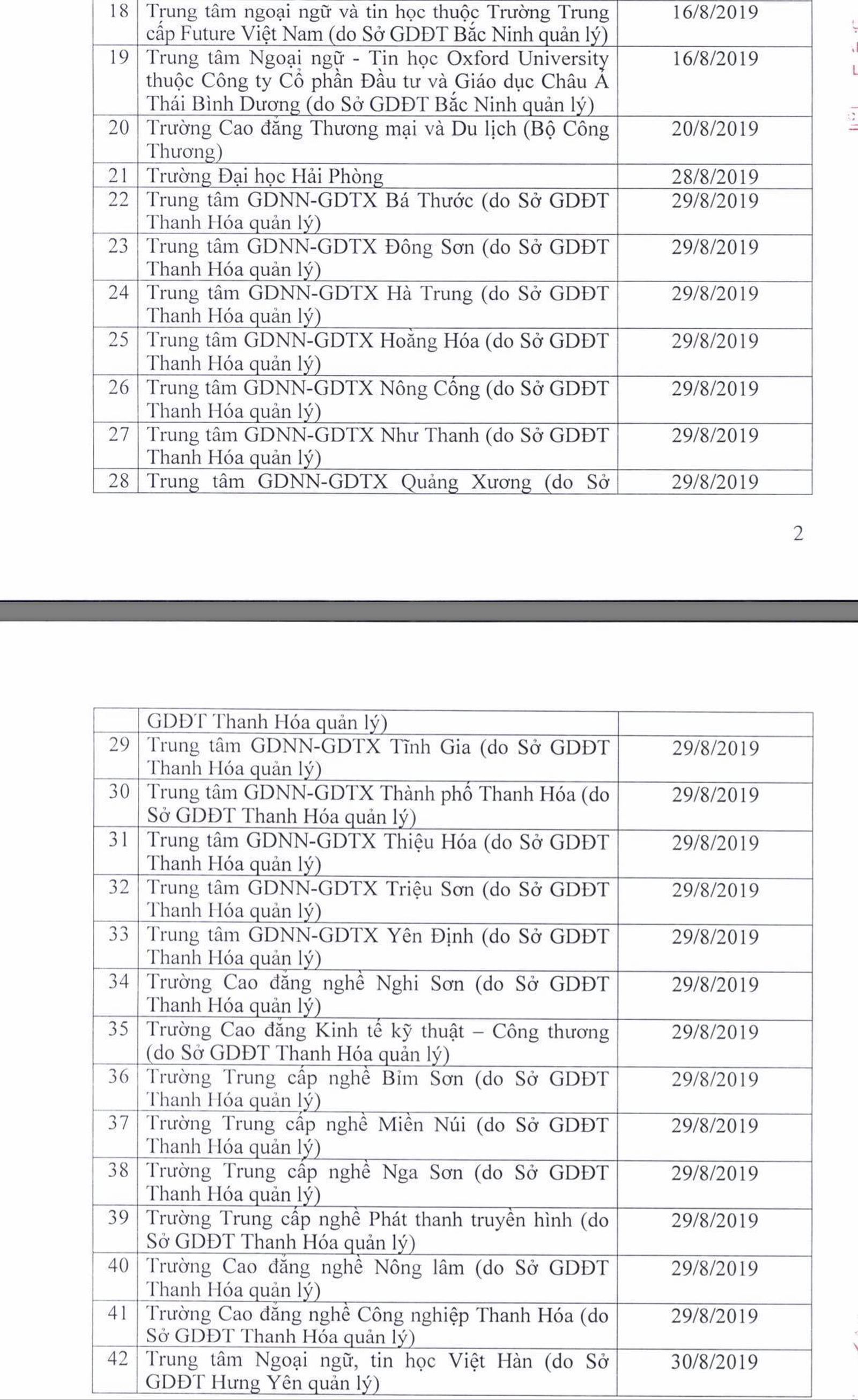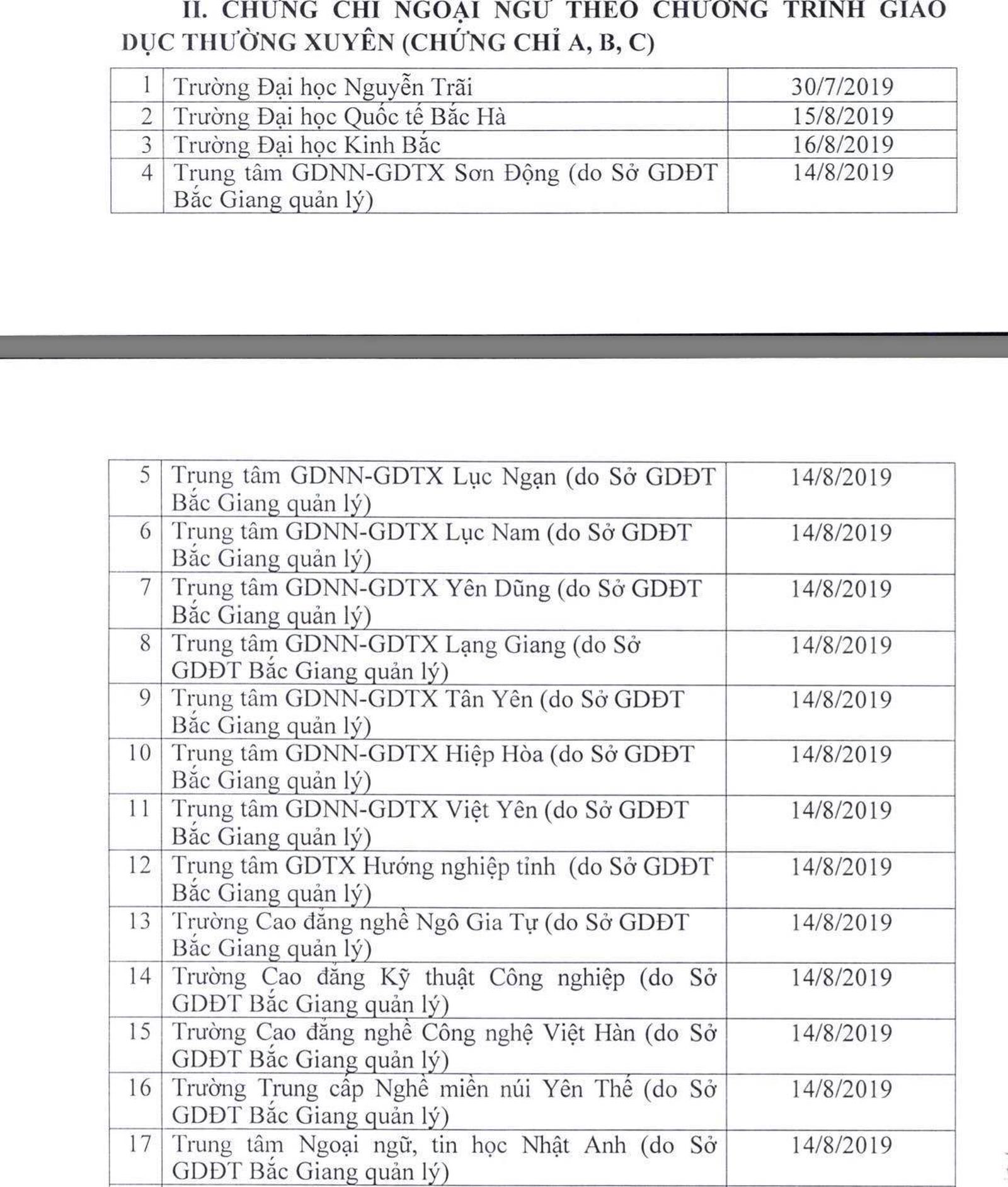 4 trường ĐH, 6 trường CĐ, còn lại là các trung tâm giáo dục nghề nghiệp - giáo dục thường xuyên trực thuộc Sở GD&ĐT các địa phương quản lý. Trong đó có tới 11 trung tâm ở các huyện do Sở GD&ĐT Bắc Giang quản lý; 2 trung tâm do Bắc Ninh Quản lý; 1 trung tâm do Hưng Yên quản lý. Riêng tại tỉnh Thanh Hóa có tới 19 đơn vị bị dừng tổ chức thi cấp chứng chỉ ngoại ngữ (gồm 11 trung tâm ở các huyện, 7 trường CĐ nghề.