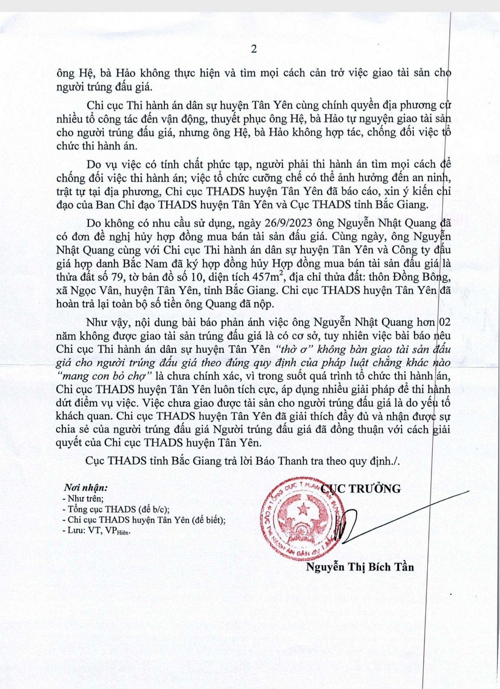 Nội dung văn bản của Cục THADS tỉnh Bắc Giang nêu rõ, việc chưa giao được tài sản cho người trúng đấu giá là do yếu tố khách quan. Chi cục THADS huyện Tân Yên đã giải thích đầy đủ và nhận được sự chia sẻ của người trúng đấu giá. Theo đó, người trúng đấu giá đã đồng thuận với cách giải quyết của Chi cục THADS huyện Tân Yên.
