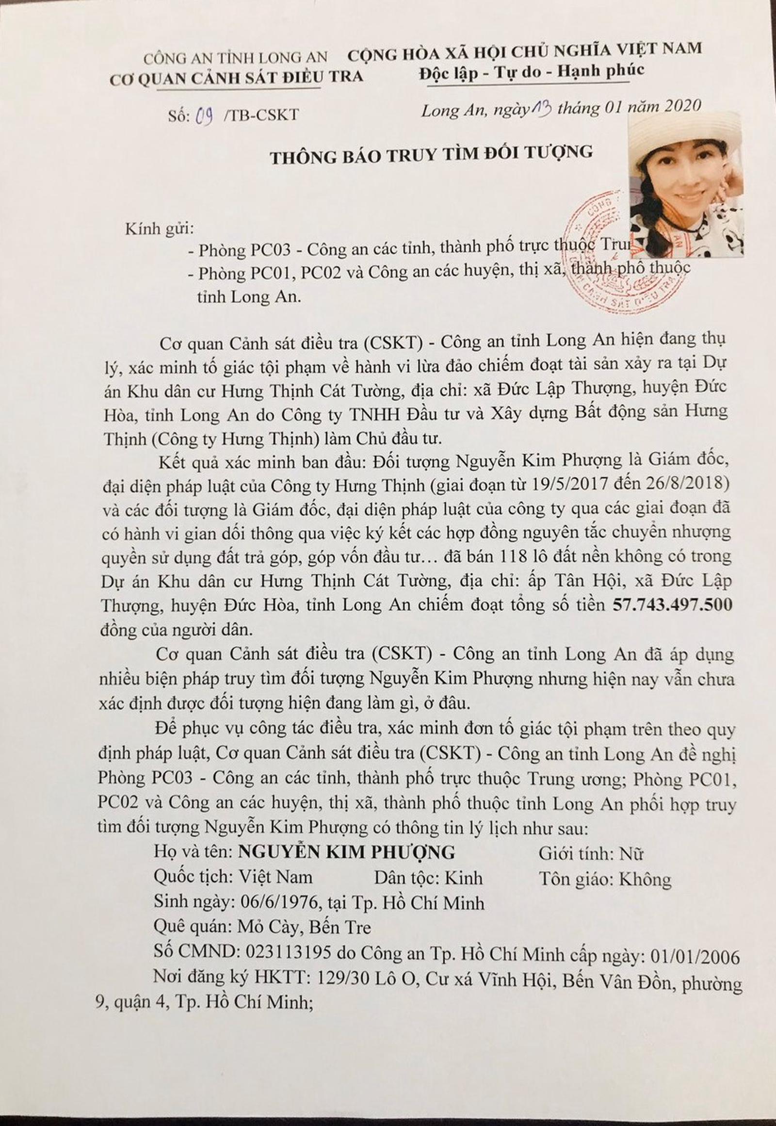 Công an tỉnh Long An đã phát thông báo truy tìm bà Nguyễn Kim Phượng cùng 3 người khác là lãnh đạo của Công ty Hưng Thịnh. (Ảnh: CT)