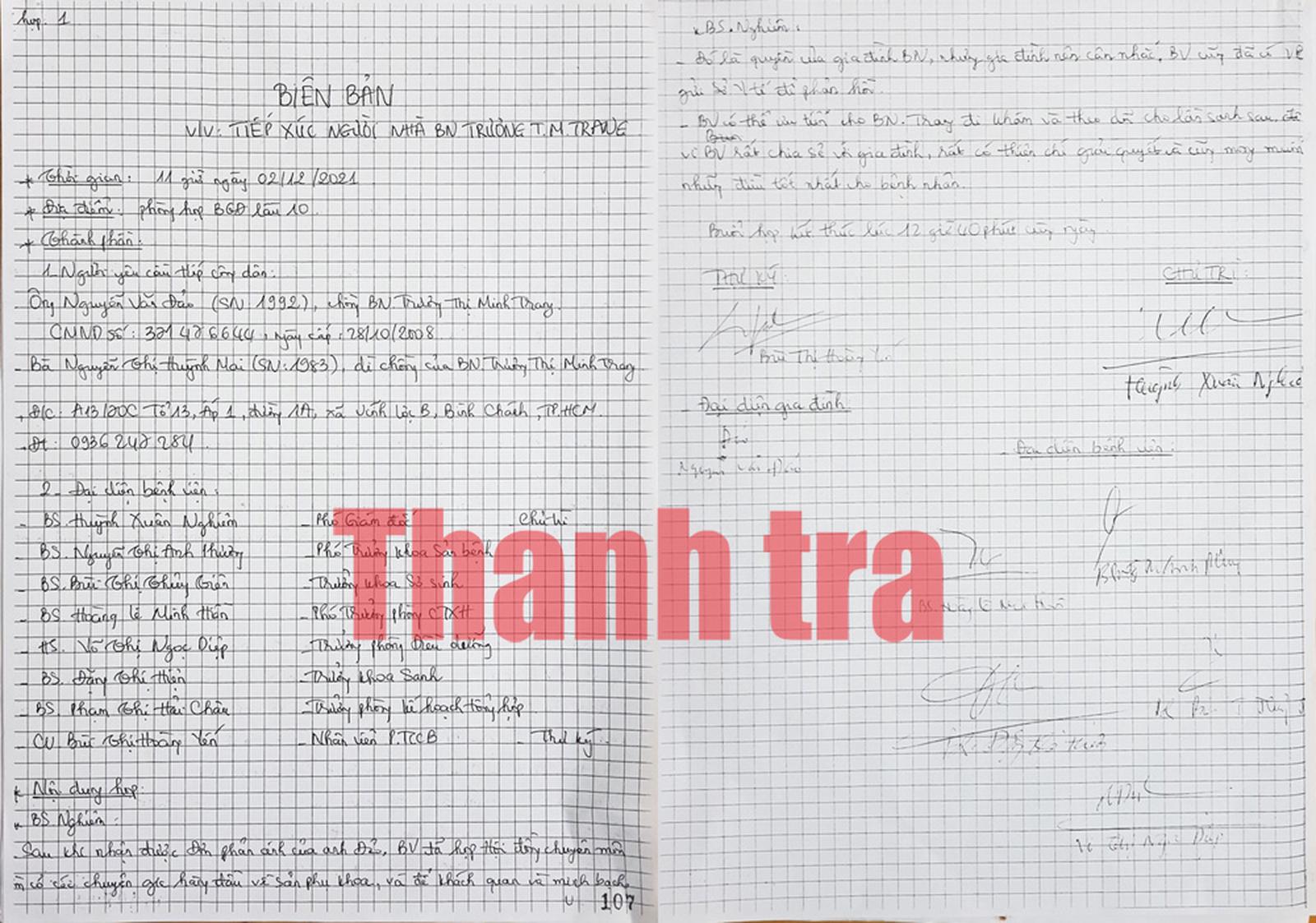Biên bản làm việc giữa gia đình sản phụ Tr.Th.M.Tr. và Bệnh viện Hùng Vương. Ảnh: CN
