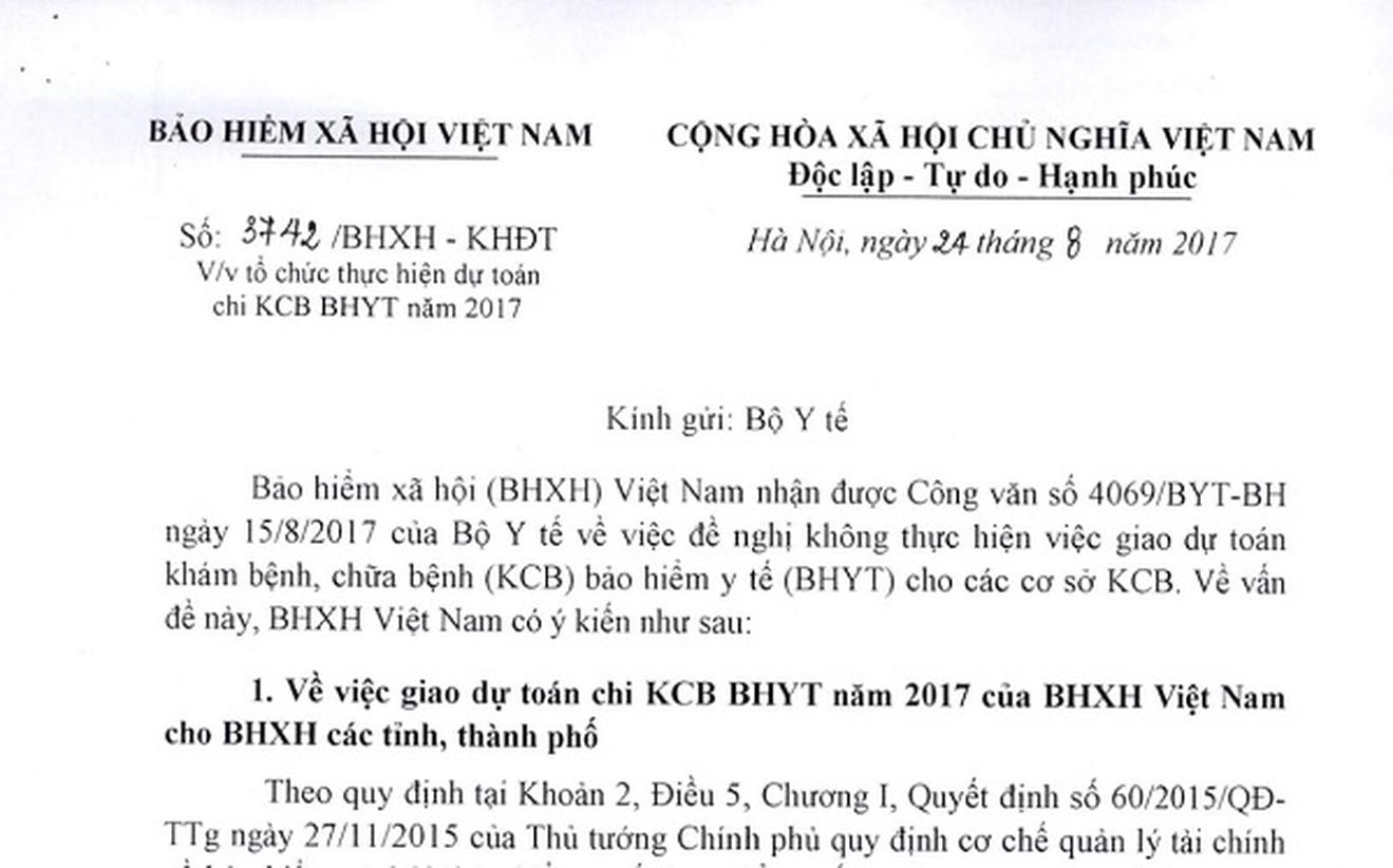 (Thanh tra) - Ngày 24/8, Bảo hiểm xã hội (BHXH) Việt Nam có Công văn số 3742/BHXH-KHĐT gửi Bộ Y tế phản hồi về việc tổ chức thực hiện dự toán chi khám chữa bệnh (KCB) bảo hiểm y tế (BHYT) năm 2017.