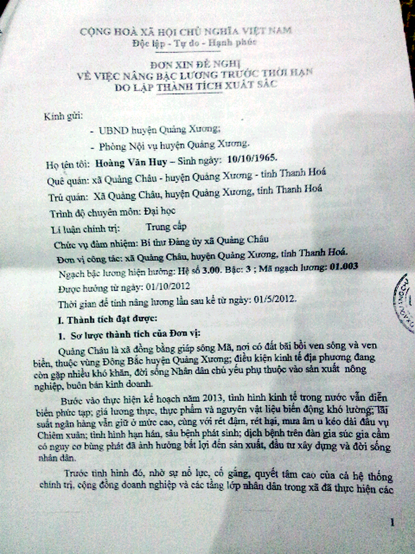 Đơn đề nghị nâng lương trước thời hạn của ông Hoàng Văn Huy, trong đó có ghi rõ thành tích là 2 giấy khen đảng viên hoàn thành xuất sắc nhiệm vụ gửi lên UBND huyện Quảng Xương. Ảnh: Văn Thanh