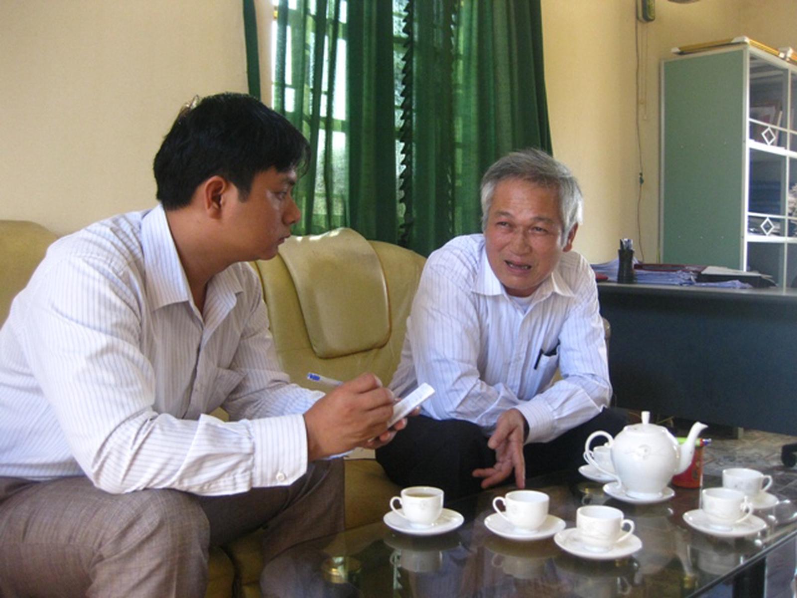 Phóng viên Báo Thanh tra (bên trái) trao đổi vụ việc với Chủ tịch UBND xã Đại Lộc. Ảnh: Văn Thanh